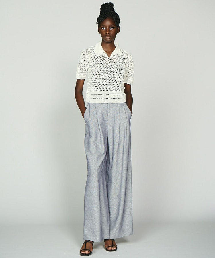 ライトウェイトのコットンを採用し、マーセライズド加工によってシルクのような光沢を持ったニットポロ。かぎ針編み(クロシェ)による透かし柄編みと袖口に手編みのスパンコールをあしらった仕様はシャープな印象を演出します