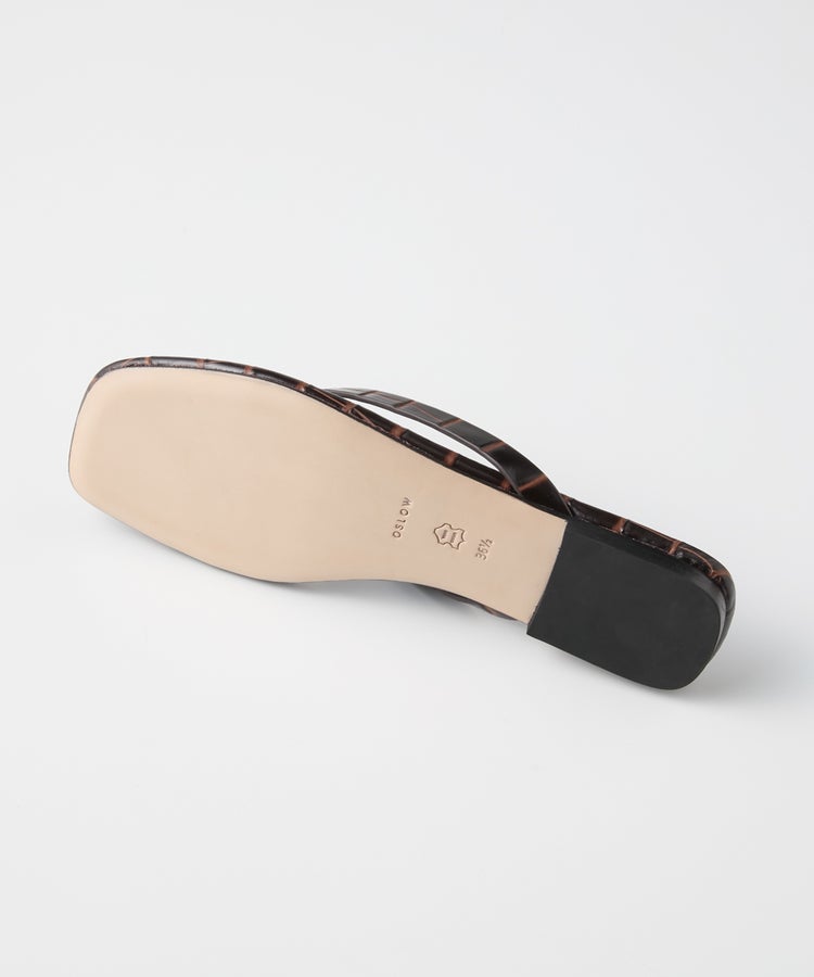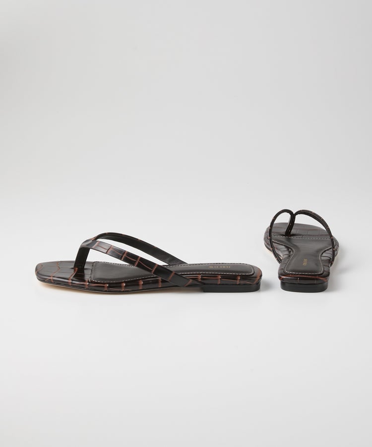 クラシックなムードに、モダンなエッセンスを掛け合わせたトングサンダル。型押しレザーの表情がさりげないアクセントとなり、足元に奥行きをプラスします。華奢なストラップとフラットなシルエットが、抜け感のある大人のバランスを演出してくれます。