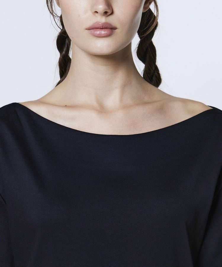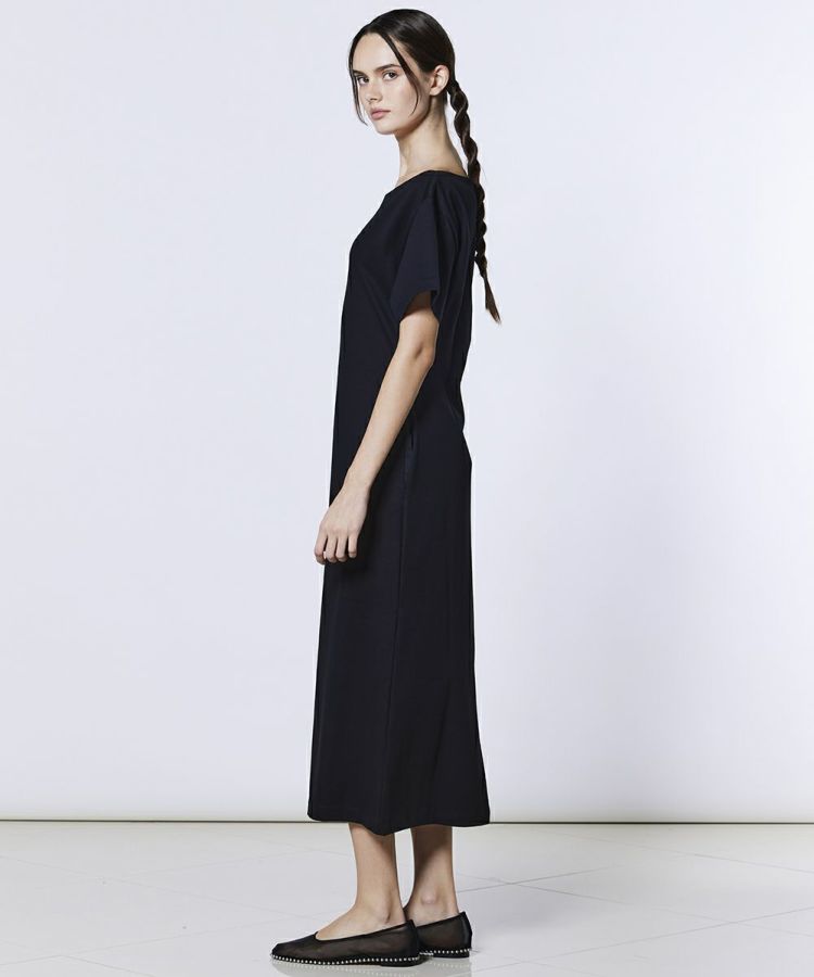 ざっくりと開いたボートネックがデコルテラインを美しく引き立て、センシュアルな大人の雰囲気を漂わせるワンピース。肉厚な素材ながらもシルエットはすっきりと美しく、カジュアルになりすぎず上品に着こなせます。ウエストには程よいくびれを持たせ、女性らしいラインを演出。背面にはスリットを施し、動きやすさと抜け感をプラスしました。