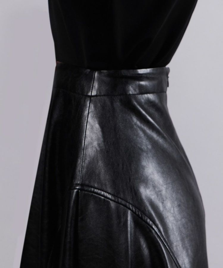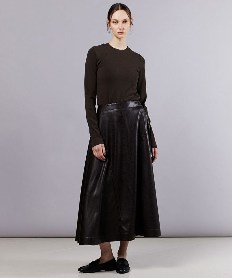 柔らかな質感の合成皮革を使用したフェイクレザースカート。サイドの切り替えラインがボリューム感のあるフレアシルエットを作り出し、女性らしい優雅な印象を演出します。全体に施されたエンボス加工がヴィンテージライクな風合いをプラス。カジュアルからモードまで幅広く楽しめる一着です。