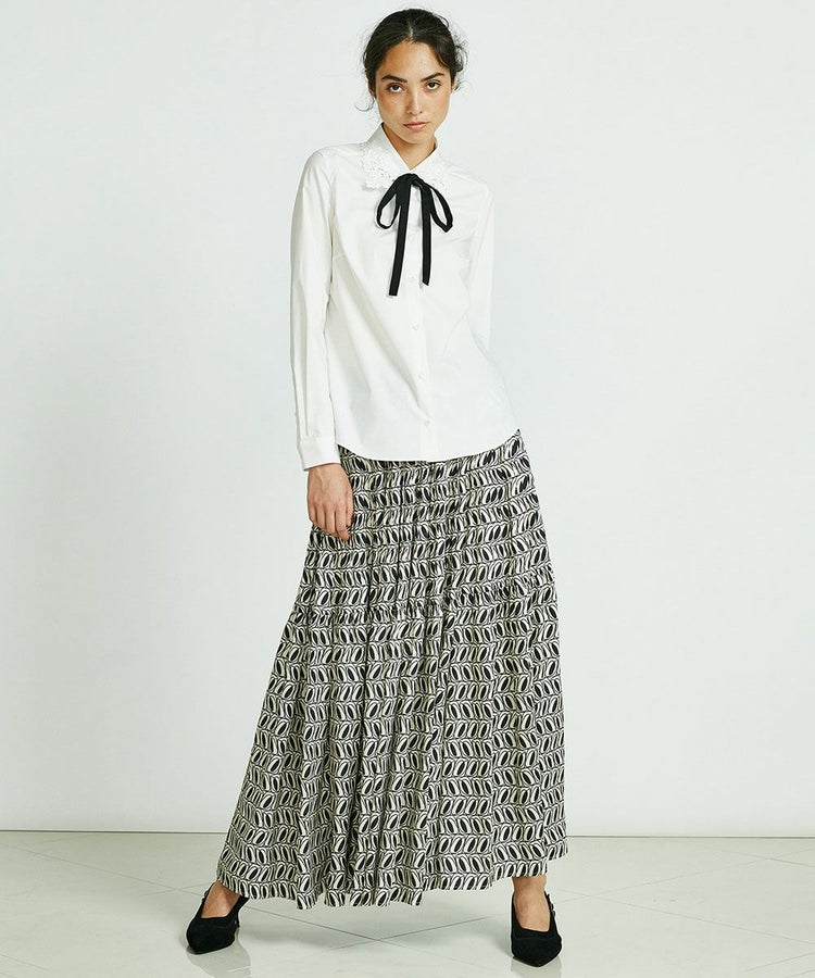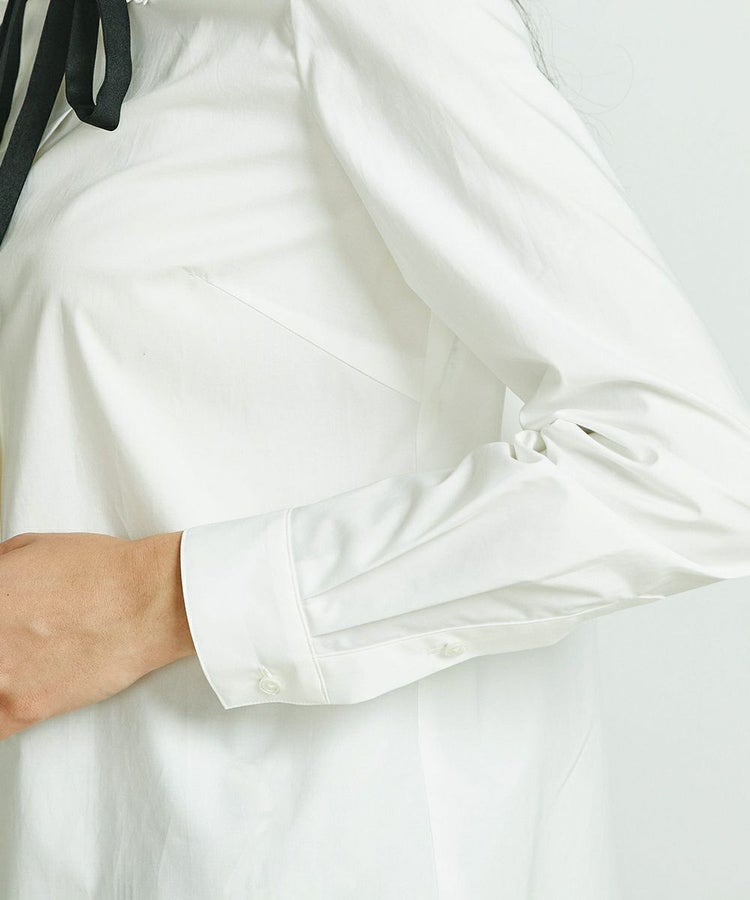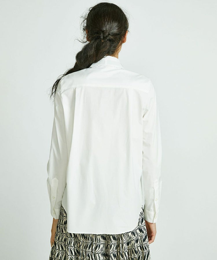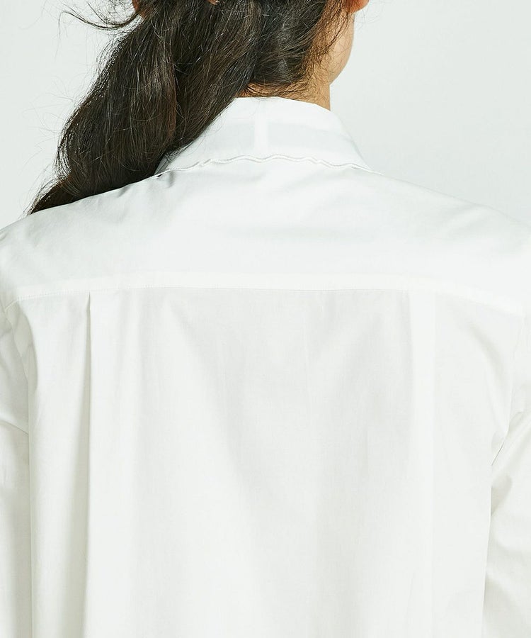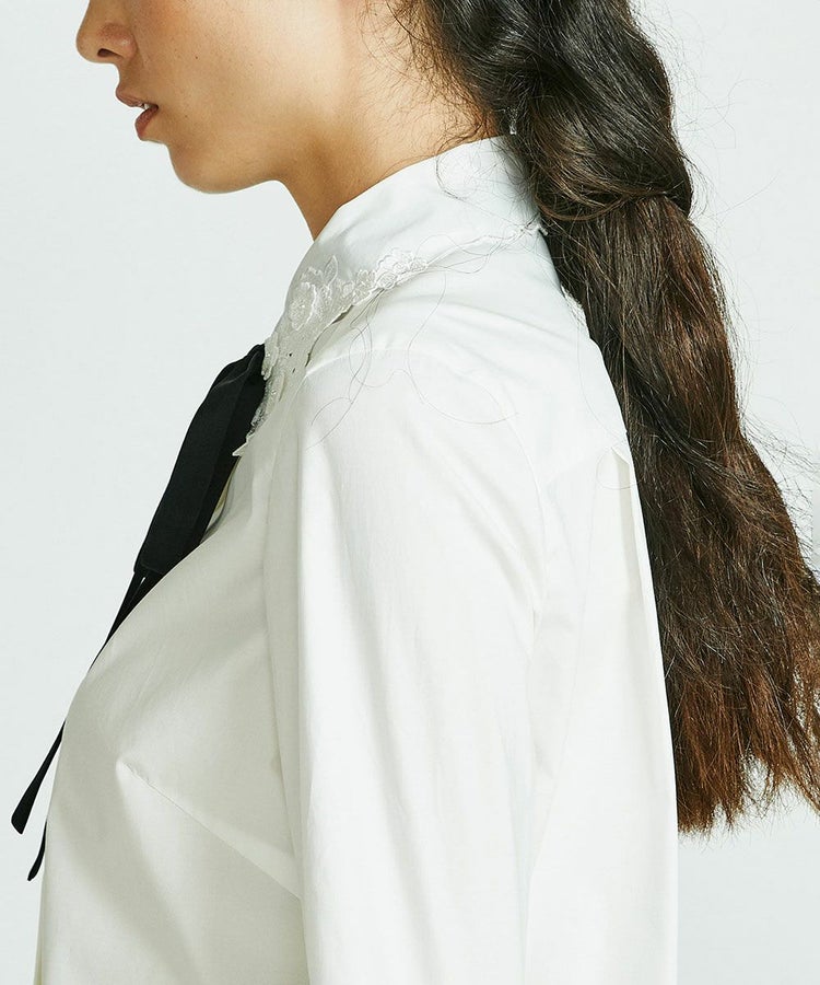 繊細な刺繍襟が上品な印象を与えるシャツブラウス。ストレッチ性のあるタイプライター生地に、パールロワイヤルという加工で反発感をプラス。薄手でありながらストレッチ性があり、襟にはオリジナルの刺繍を施してリッチで品のあるブラウスに仕上げています。無駄のない美しいシルエットなので、着まわし力は抜群。付属のリボンは取り外し可能です。