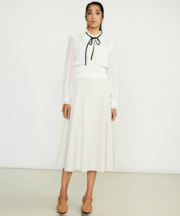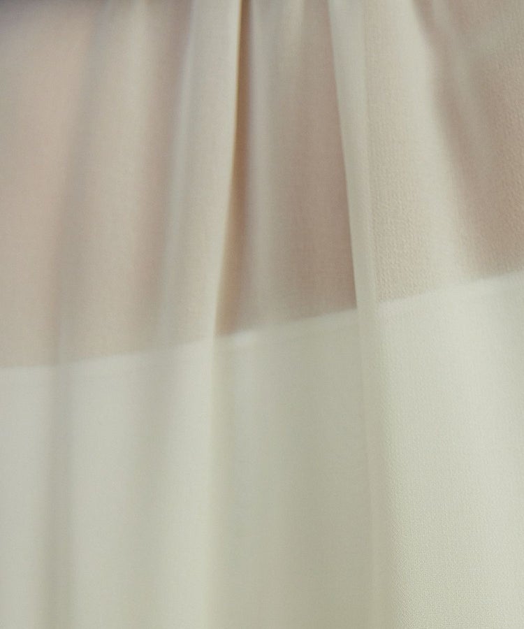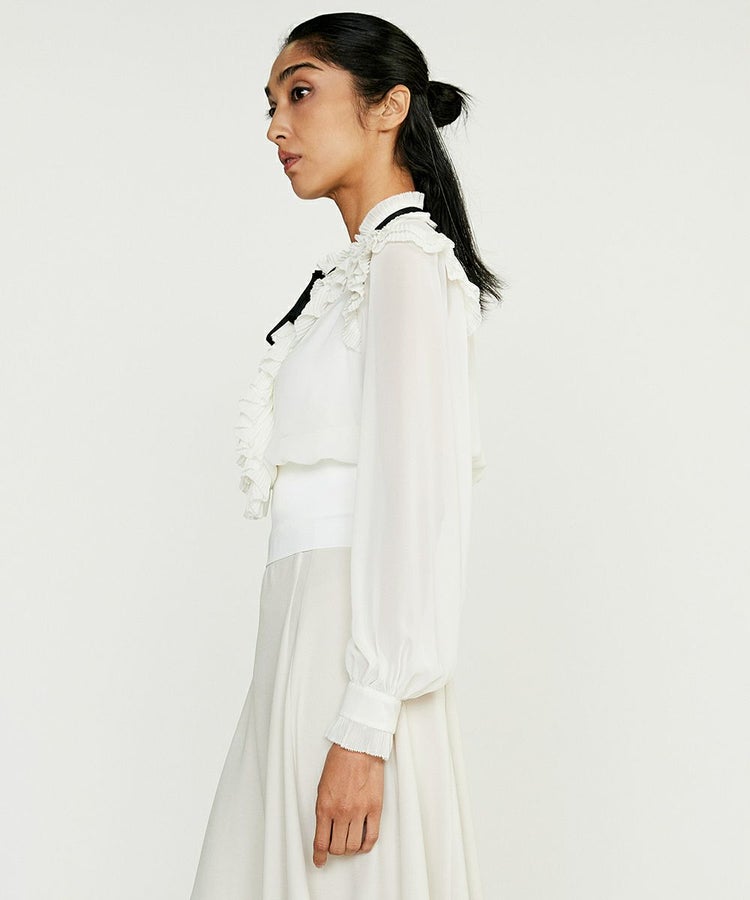 シアーな質感が美しいブラウス。シフォンクリスタルプリーツをギャザーフリルに、端はピコ始末にするなど贅沢なデザインディテールが光ります。ウエスト部分には定番のヴィスコースナイロンのダル糸でリブ編み仕様にしており、とても上品なルックスに仕上がっています。どんなボトムと合わせても品良くきれいめなコーディネートが完成するブラウスです。