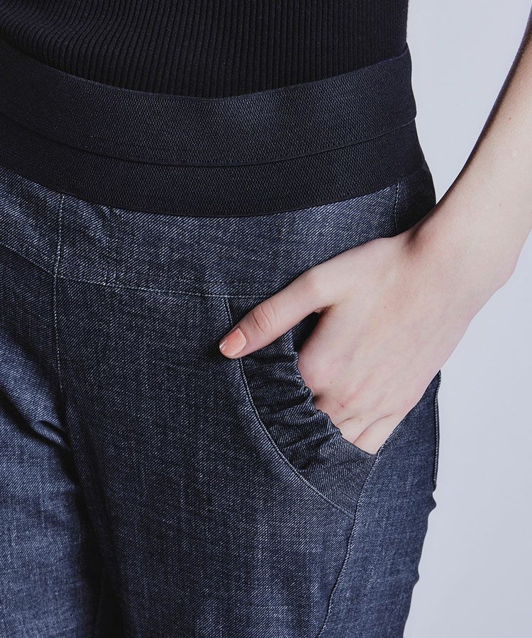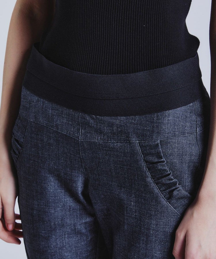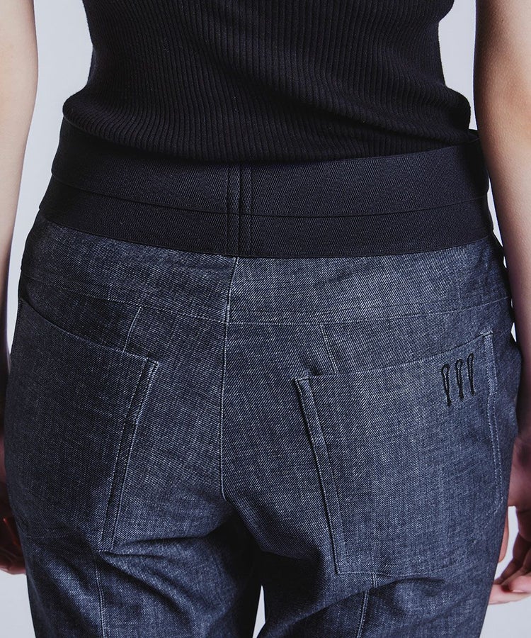 ダブスタ定番人気のメリル素材を使用したパンツシリーズより、味わい深いインディゴデニムライクな新作が登場。ニットやアウターなど、トップスにボリュームの出やすい冬の着こなしを、すっきりとスタイリッシュにまとめてくれる細身シルエット。モードな切り替えと計算された美脚パターンで、着映えと体形カバーを両立。ウエストには幅広ゴムを採用。伸びやかな素材で動きやすく、ノーストレスな着心地で、きちんと感とカジュアルさを兼ね備えています。