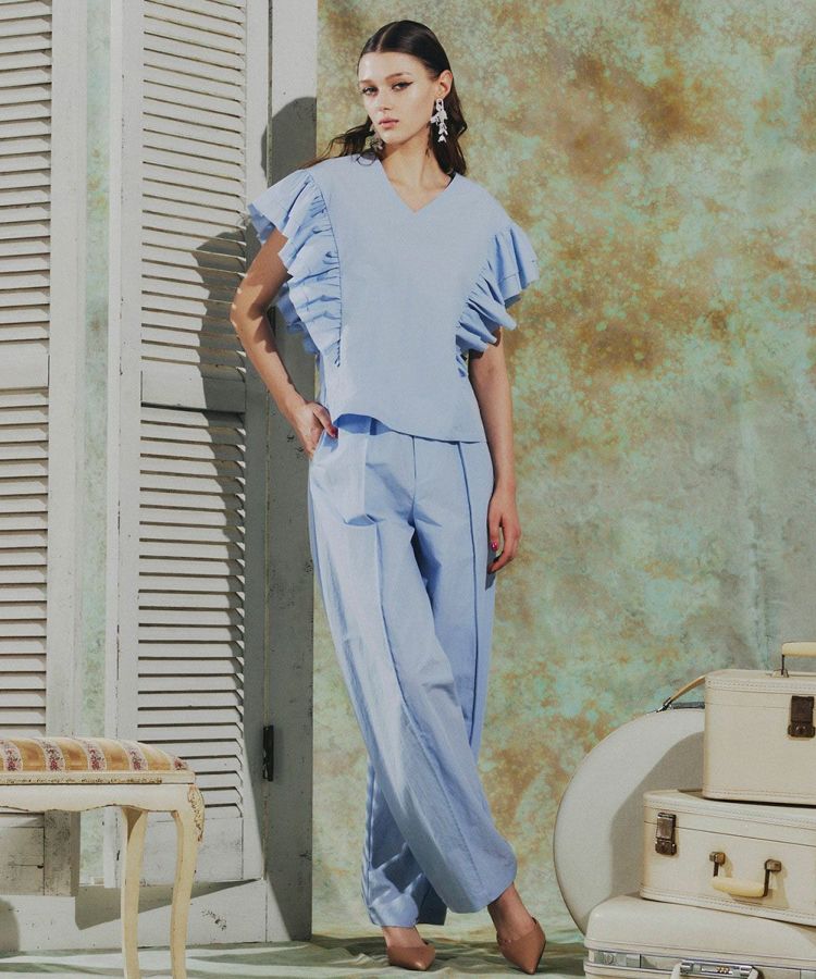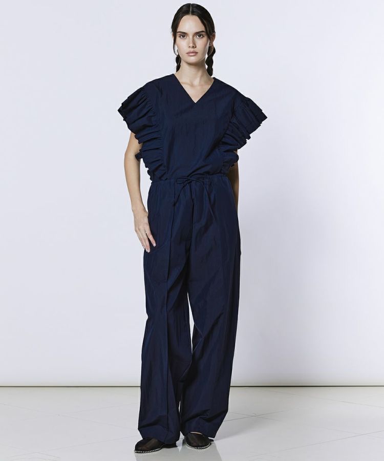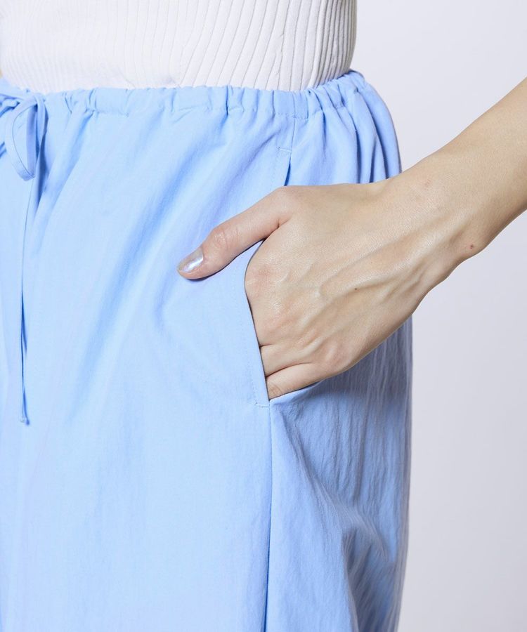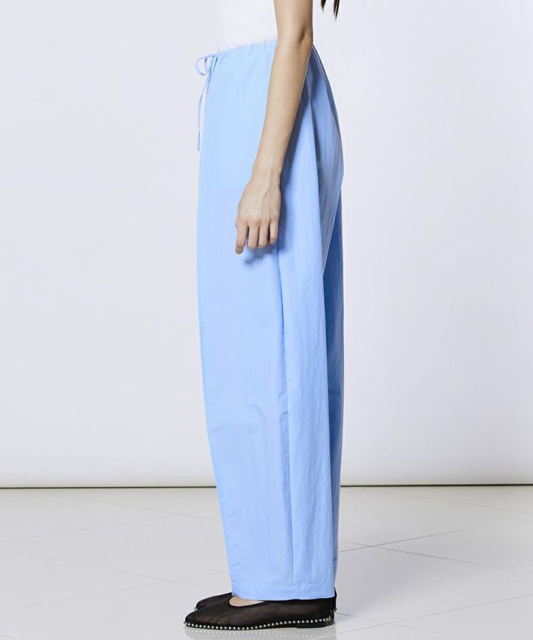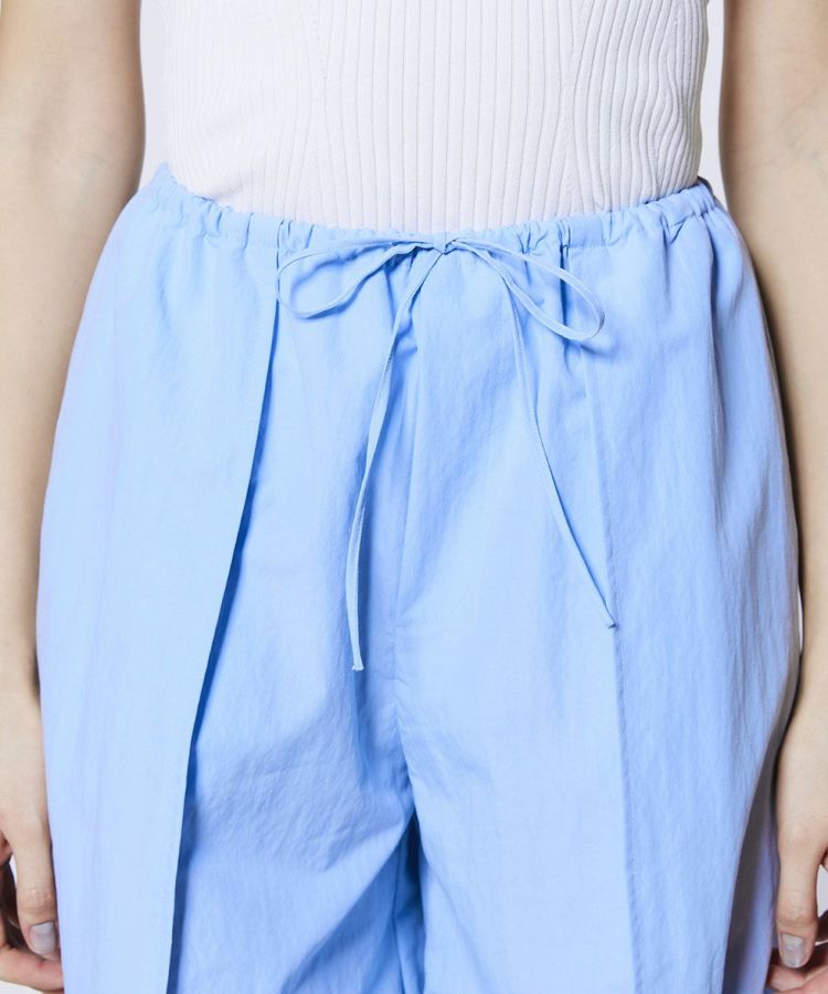 程よくゆとりのあるシルエットが、リラクシンな雰囲気を演出するパンツ。縦のラインを強調するデザインで、すっきりとした印象とスタイルアップを両立します。ウエストはゴム仕様で、長時間の着用でも快適なはき心地に。同素材のトップス(型番:0304400261)と合わせれば、統一感のあるセットアップスタイルも楽しめます。