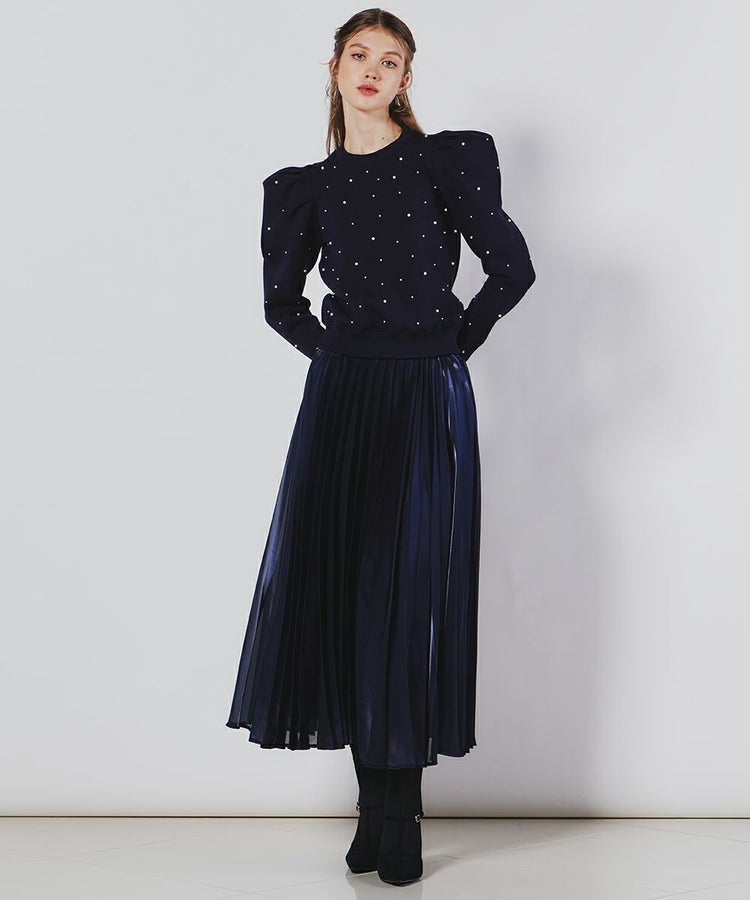 ネイビーのプルオーバーに、パールをたっぷりあしらったクラシカルで上品なトップス。女性らしい印象ながらも、パフスリーブでエッジを効かせました。コンパクトなフォルムで、パンツにもスカートにも合わせられるのが魅力的。プラスするだけで着こなしが華やかになる、大人かわいいアイテムです。