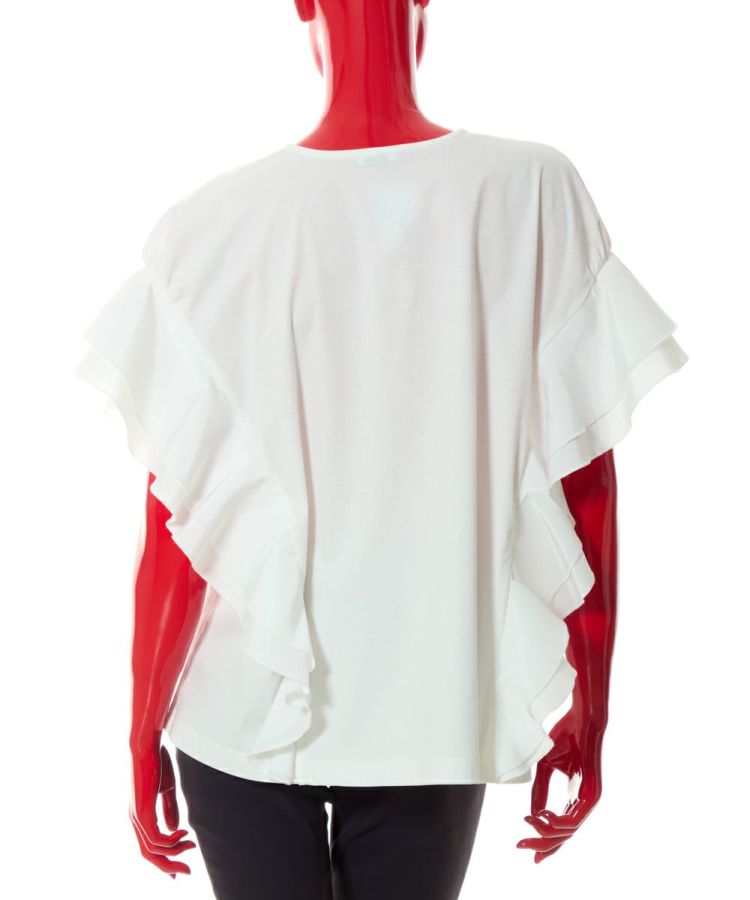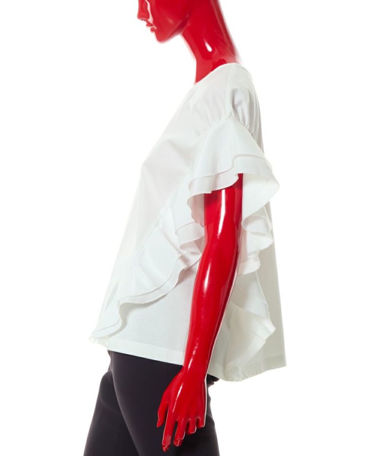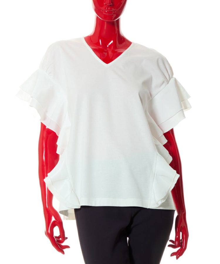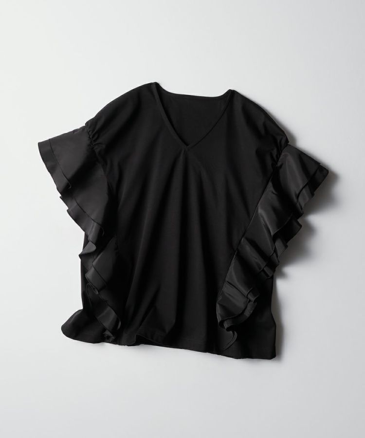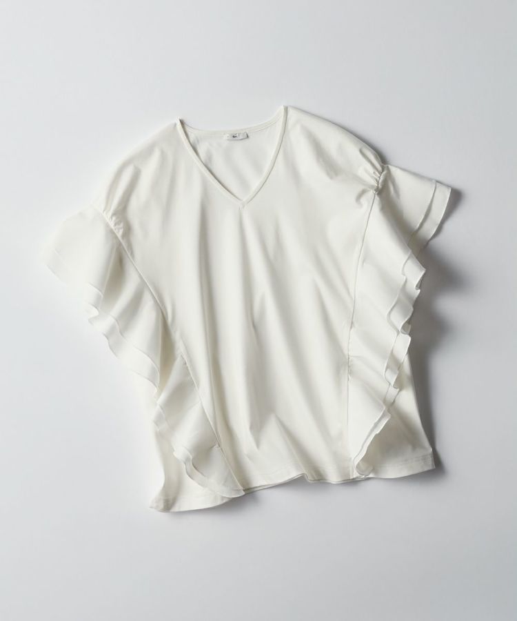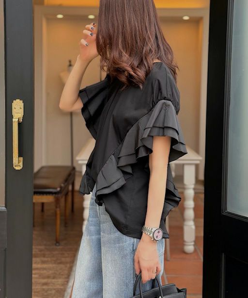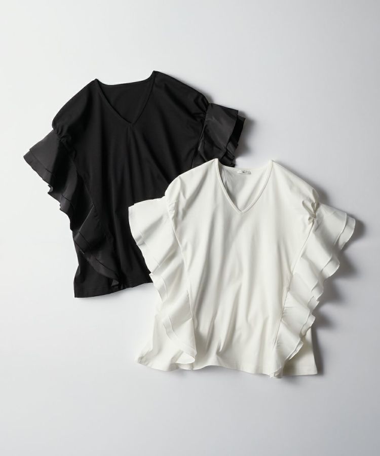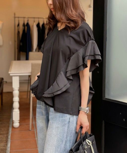シンプルなデザインながら、女性らしいエッセンスをプラスしたトップス。袖から裾にかけてあしらったフリルが、縦ラインを強調し華奢見えを実現してくれます。首元はVネックで胸元にシャープな抜け感を演出。カラーは使い回しが効くオフとブラックの2種類展開で、シーンを選ばず使えるのも魅力的です。