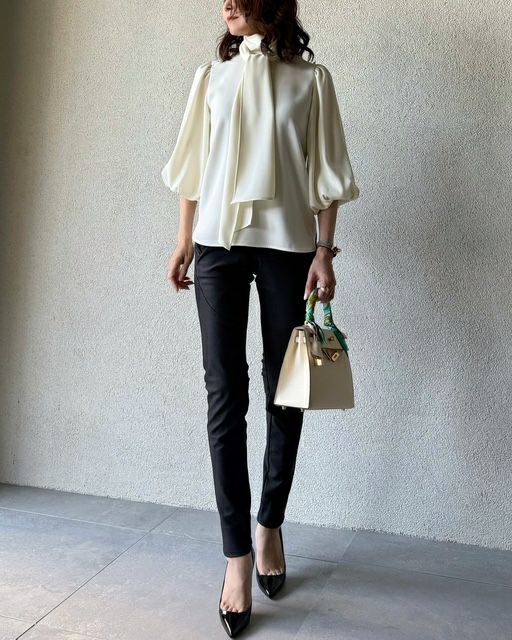 ふんわりとしたパフスリーブとドレープの効いたデザインが手元を美しく演出するブラウス。ハイネックできちんと感がありながらも、大ぶりのリボンがフェミニンです。また、さらりとした質感となめらかな表面、ドレープを効かせたデザインが上品。デニムを合わせて大人カジュアルに、タイトなスカートを合わせてオケージョンにと、幅広いシーンで活躍するアイテムです。