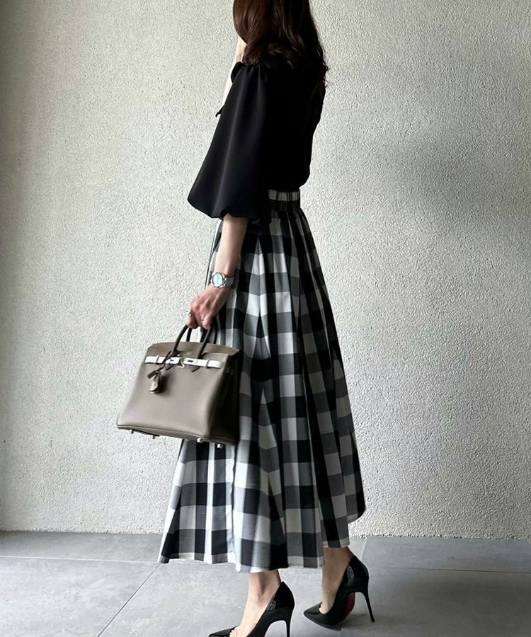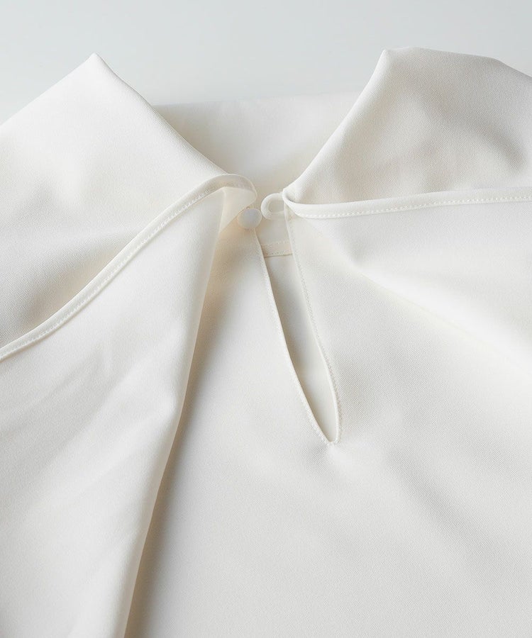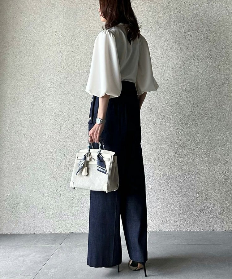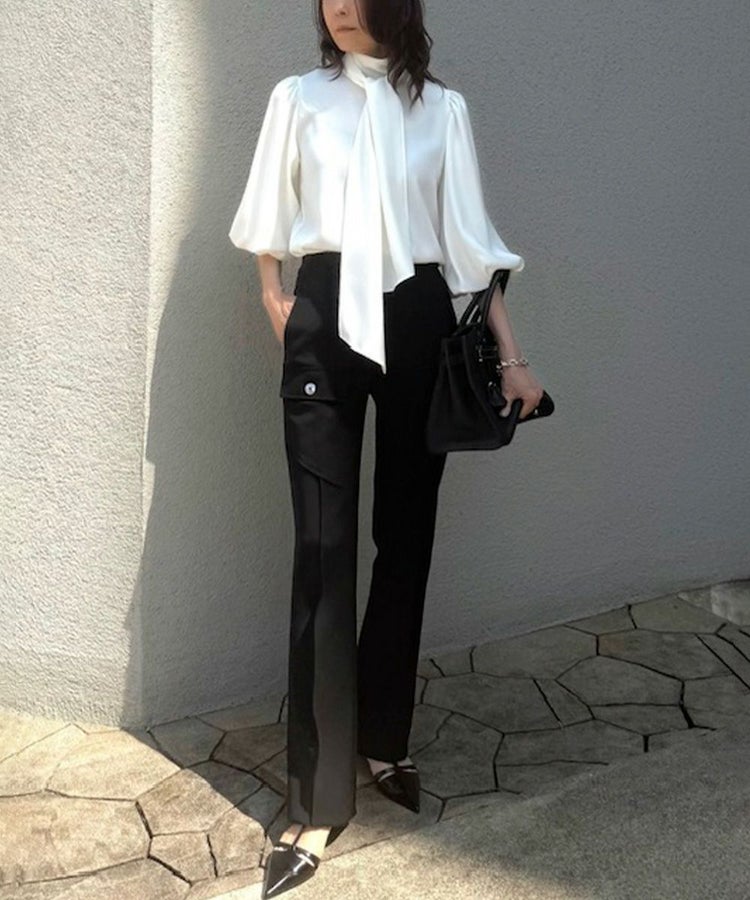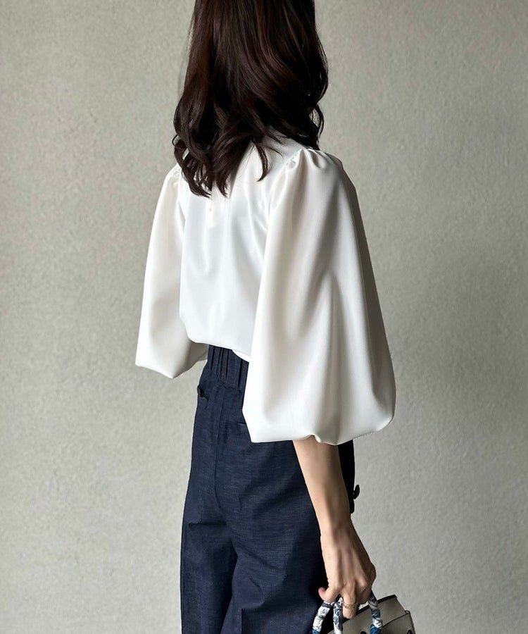 ふんわりとしたパフスリーブと、優雅なドレープが手元を美しく見せてくれるブラウス。きちんと感のあるハイネックに、大ぶりのリボンがフェミニンなアクセントを添え、甘さと品のよさを両立しました。さらりとした肌ざわりと、なめらかな表面感が上品さを引き立て、着るだけで華やかな印象に。デニムを合わせて大人カジュアルに、タイトなスカートを合わせてオケージョンにと、幅広いシーンで活躍するアイテムです。