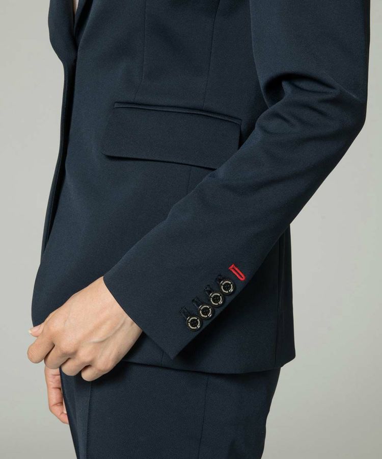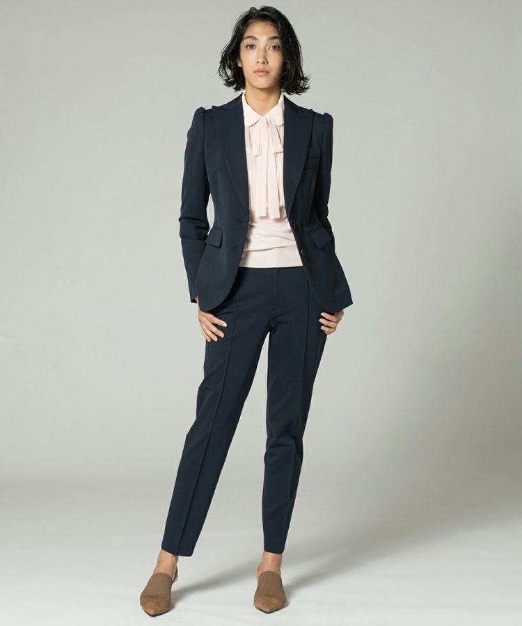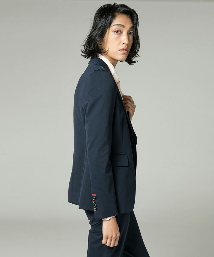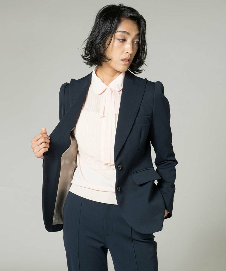 シルエットの美しさが引き立つ、Sov.自慢のDIVAジャケット。肩部分にギャザーを入れ、丸みのあるフェミニンなラインを演出。ウエスト周りもシェイプさせているため、スマートで女性らしいシルエットをつくります。やや幅広で丸みを帯びた襟デザインも魅力。袖口の赤ステッチがデザインのアクセントです。同素材のパンツ(商品番号 0506071201)とセットアップで着こなせます。