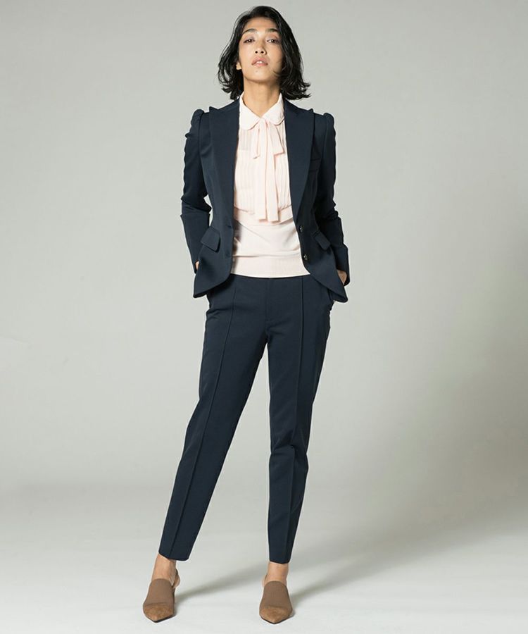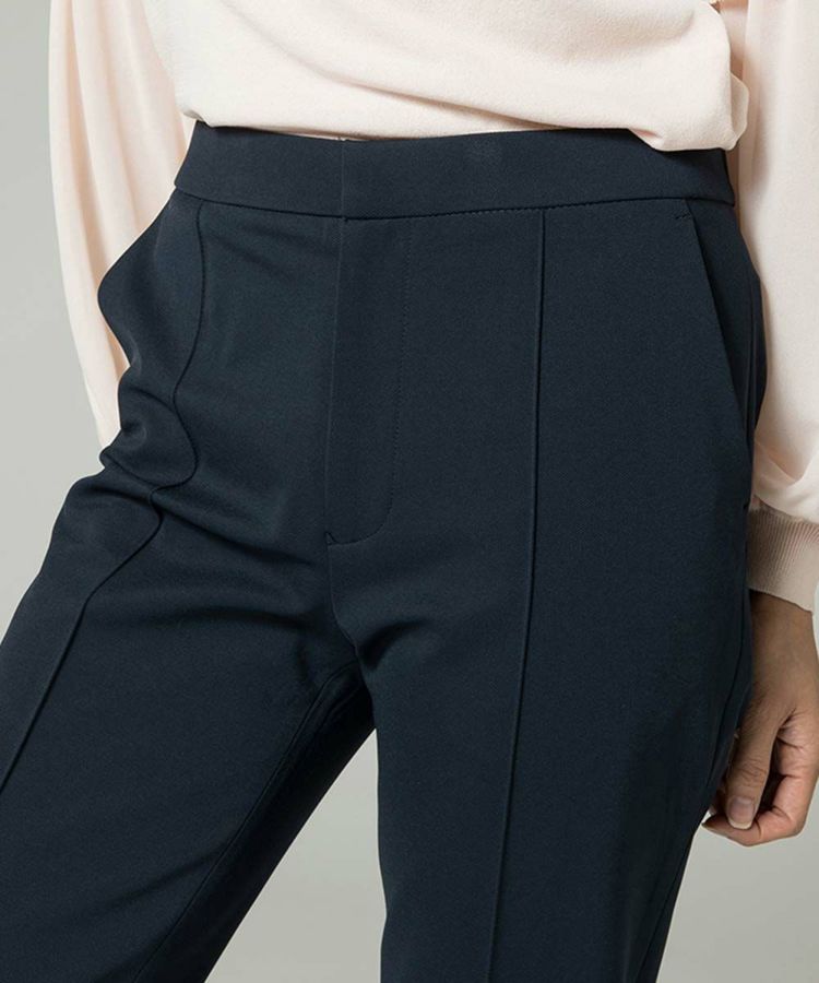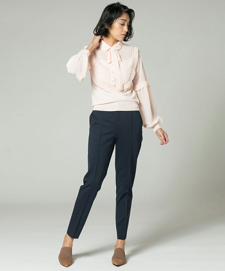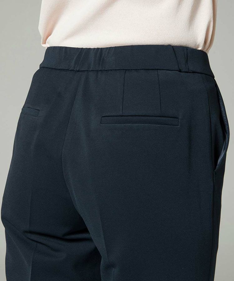 Sov.で定番人気を誇るDIVAパンツ。細身でありながらボディラインを拾いにくく、スマートで美しい脚線を演出。レーヨン混素材のきれいな風合いや、すっきりと加えられたセンタープレス、足首を細く見せる丈感のバランスが絶妙。後ろウエストは締め付けにくいゴム仕様ですが、フロントはフラットなのでトップスをインにしてもきれいに決まります。同素材のジャケット(商品番号 0505070201)とのセットアップもおすすめ。