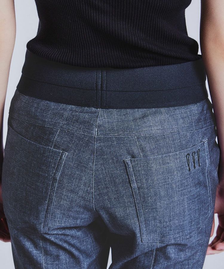 ダブスタ定番人気のメリル素材を使用したパンツシリーズより、味わい深いインディゴデニムライクな新色が登場。ニットやアウターなど、トップスにボリュームのある着こなしをすっきりとスタイリッシュにまとめてくれる細身のシルエットです。モードな切り替えと計算された美脚パターンで、着映えと体型カバーを両立。ウエストには幅広ゴムを採用しているため、伸びやかな素材で動きやすく、ストレスの少ない着心地。きちんと感とカジュアルさを兼ね備えた一本です。
