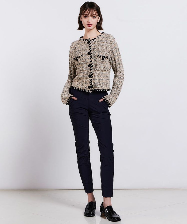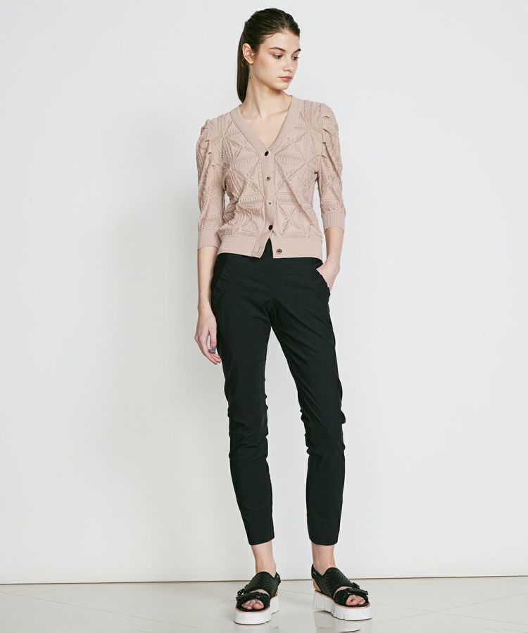 Sov.のロングセラーアイテム、メリルハイテンションパンツ。長時間のデスクワークでも形くずれしないデザイン、ストレッチ性に優れたレギンスライクでノーストレスな履き心地がポイント。ウエストはゴム仕様ながらもフラットになっているので、トップスをインしてもきちんと感が出るのが魅力です。ポケット部分のさりげないフリルや、足元をすっきり見せてくれるアンクル丈など、ディテールも抜かりなし。トップスを選ばず、スニーカーでもスタイル良く決まる一本です。