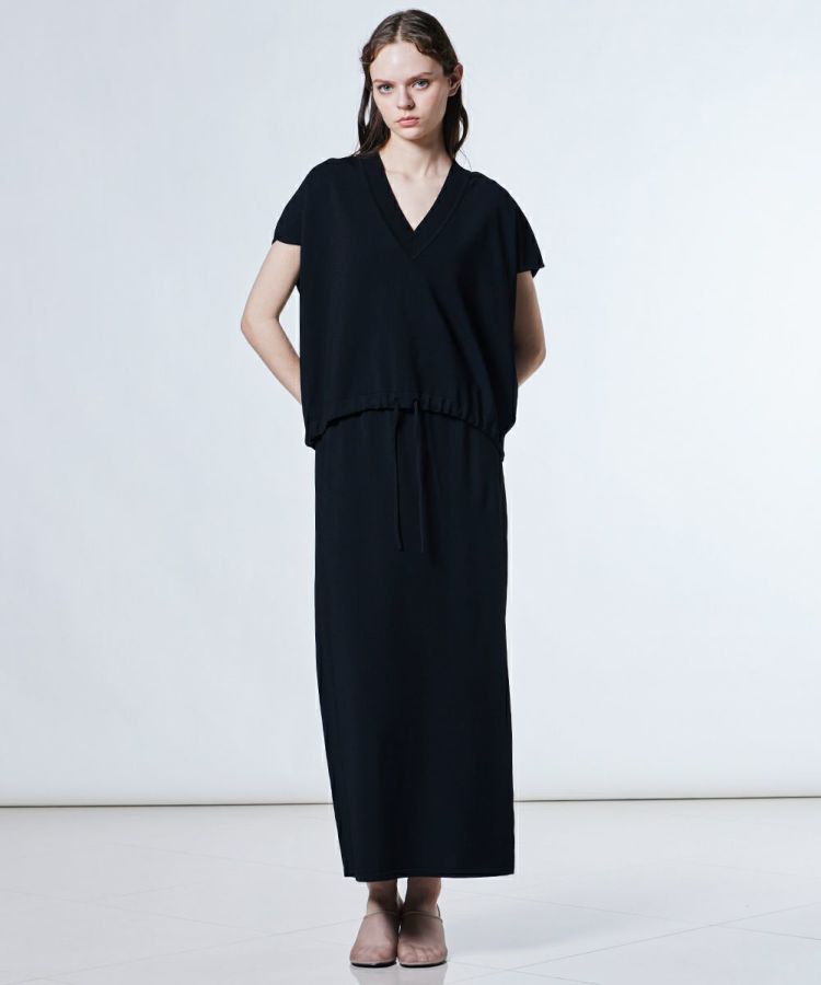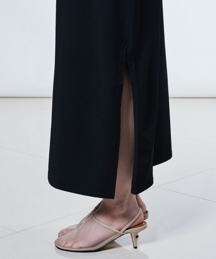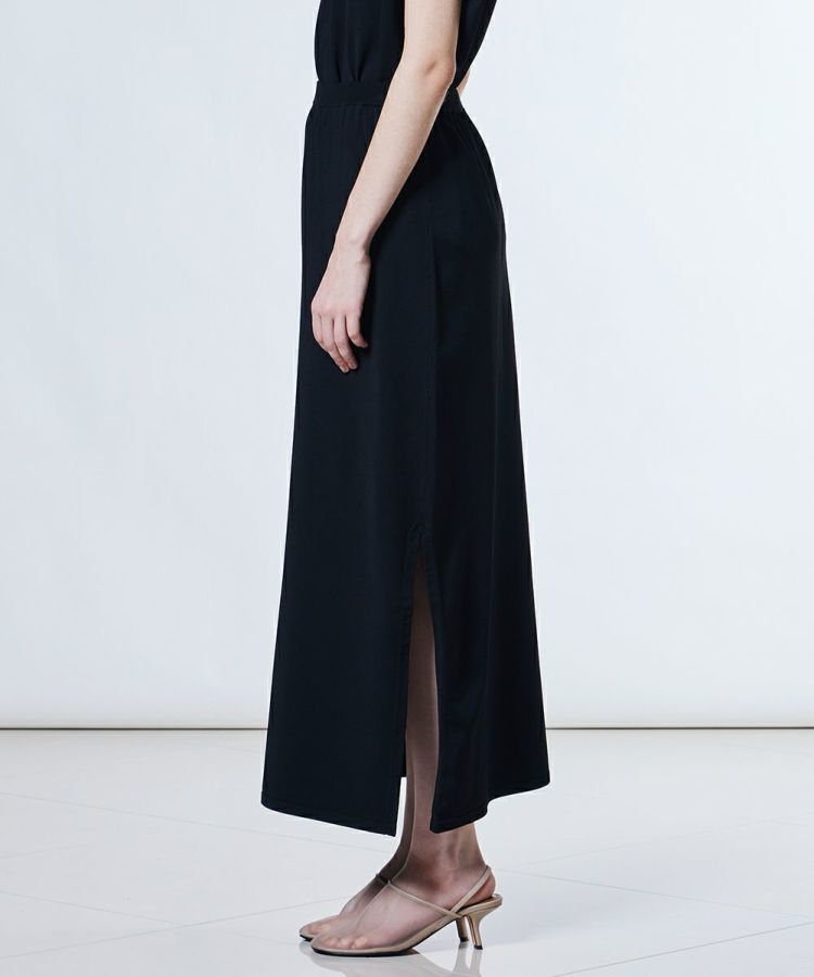 レーヨンとポリエステルの撚糸素材を使用した、なめらかで上品な肌ざわりが魅力のロングスカート。身体のラインを拾いすぎない絶妙なサイズ感で、タイトシルエットが苦手な方にも取り入れやすいデザインに仕上げました。サイドにはスリットを入れて歩きやすさも配慮。同素材のプルオーバー(型番:0309080253)と合わせれば、ワンピースようなセットアップスタイルも楽しめます。