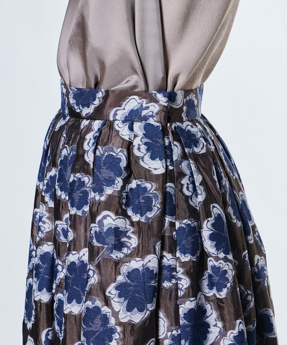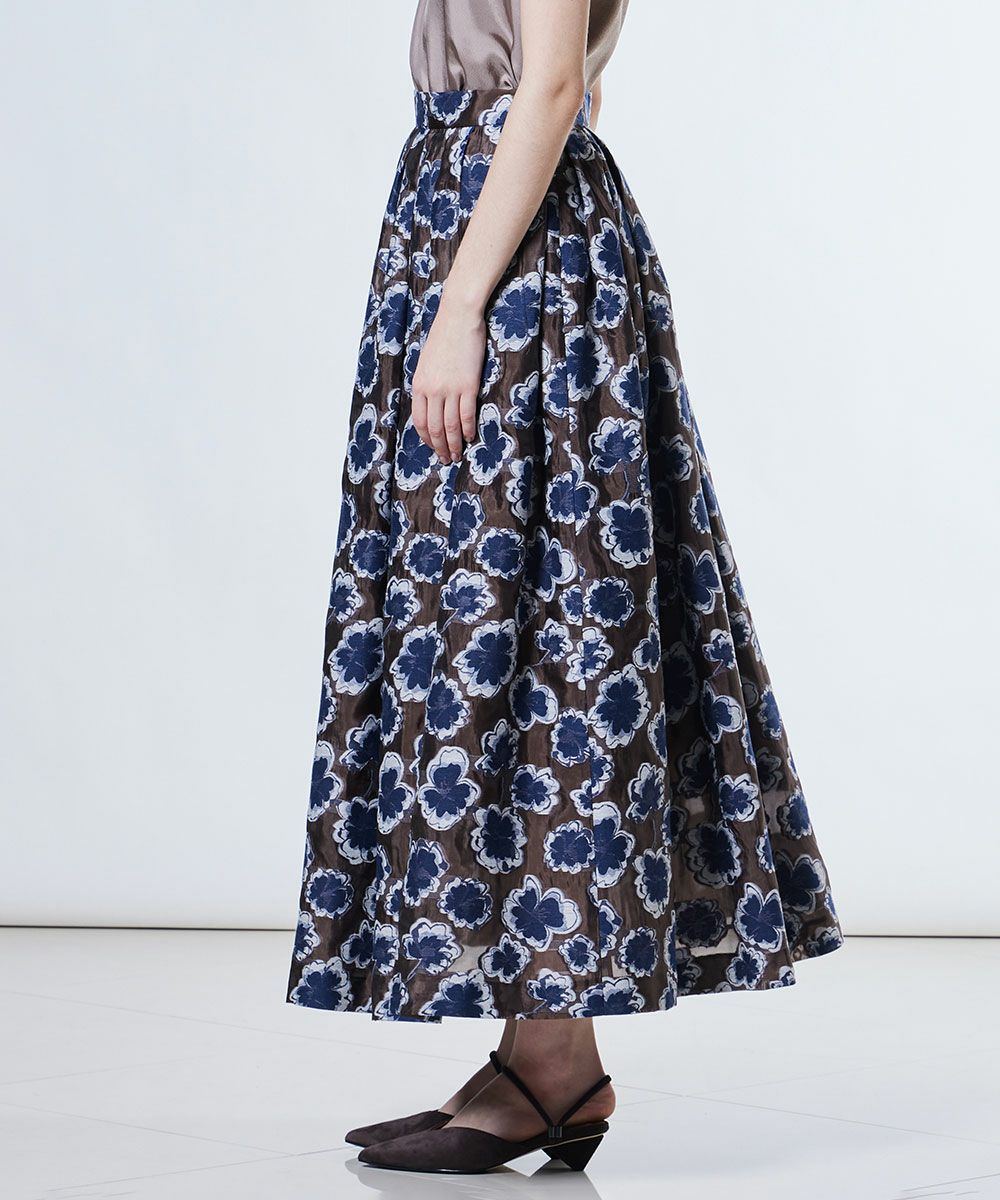 落ち着いたカラーリングの花柄を全面にあしらったシックなロングスカート。ジャガード織り機で丁寧に柄を織り込み、上品な光沢感と立体感な表情を演出しました。歩くたびに揺れる美しいシルエットが、佇まいにエレガントな雰囲気を添えてくれる一着。シンプルなトップスと合わせるだけで、品よく決まる大人のスタイリングが完成します。