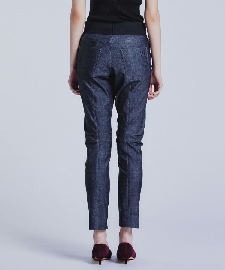 ダブスタ定番人気のメリル素材を使用したパンツシリーズより、味わい深いインディゴデニムライクな新作が登場。ニットやアウターなど、トップスにボリュームの出やすい冬の着こなしを、すっきりとスタイリッシュにまとめてくれる細身シルエット。モードな切り替えと計算された美脚パターンで、着映えと体形カバーを両立。ウエストには幅広ゴムを採用。伸びやかな素材で動きやすく、ノーストレスな着心地で、きちんと感とカジュアルさを兼ね備えています。