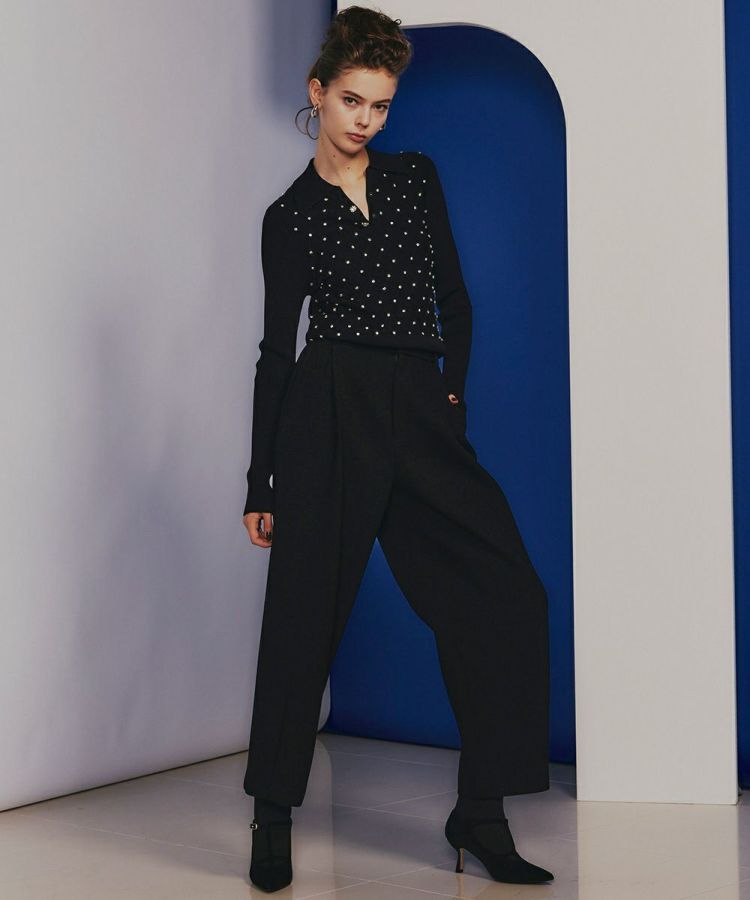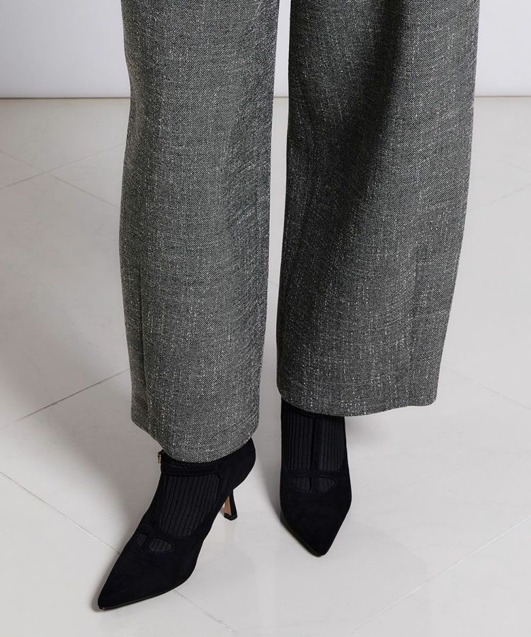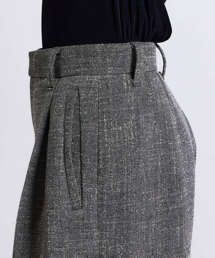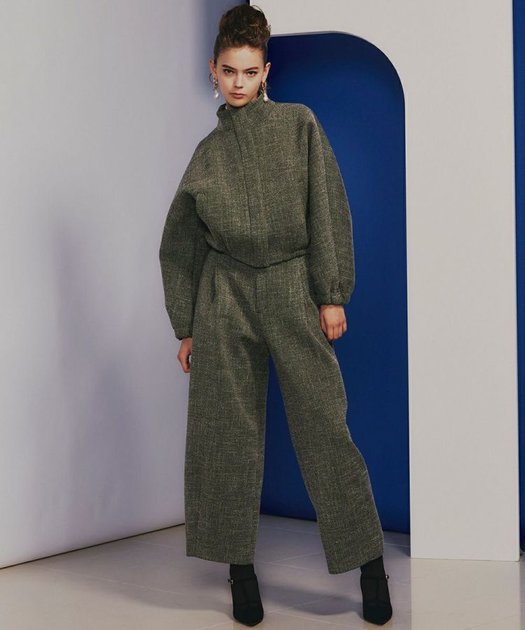 梳毛調合繊トリクションとレーヨンリング糸を使用し、ウールのような表情・風合いを出したツイード素材のパンツ。ボンディング加工をすることで、軽さを出すとともに、ハリ感のある立体的なワイドシルエットに仕上げました。裾に向かってやや丸みがある独特のフォルムで、横から見てもサマになる、モード感のある一本です。