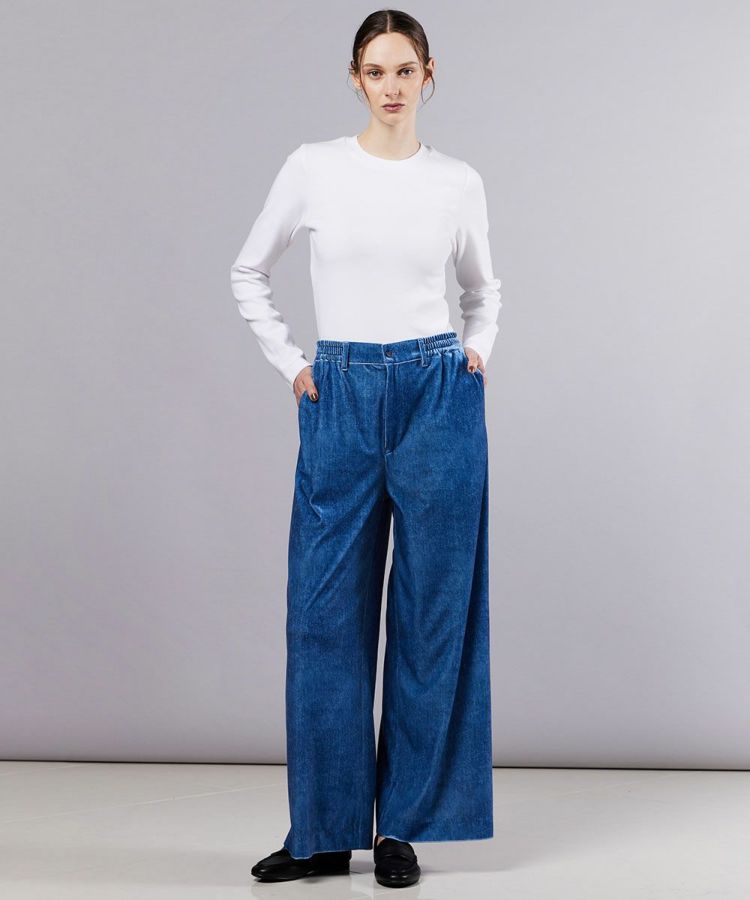 柔らかな質感が魅力のベロア素材を贅沢に使用したパンツ。均一な起毛感が美しく表情豊かな生地にデニムプリントを施し、他にはない風合いを演出しました。ストレートシルエットが脚のラインをすっきりと見せ、スタイルアップを実現。同素材のシャツ(型番:0304460253)とのセットアップスタイルはもちろん、シンプルなTシャツやカットソーに合わせてラフに着こなすのもおすすめです。