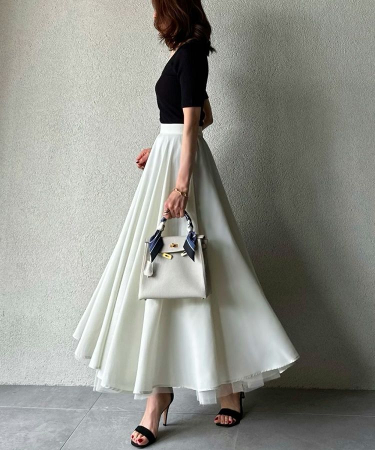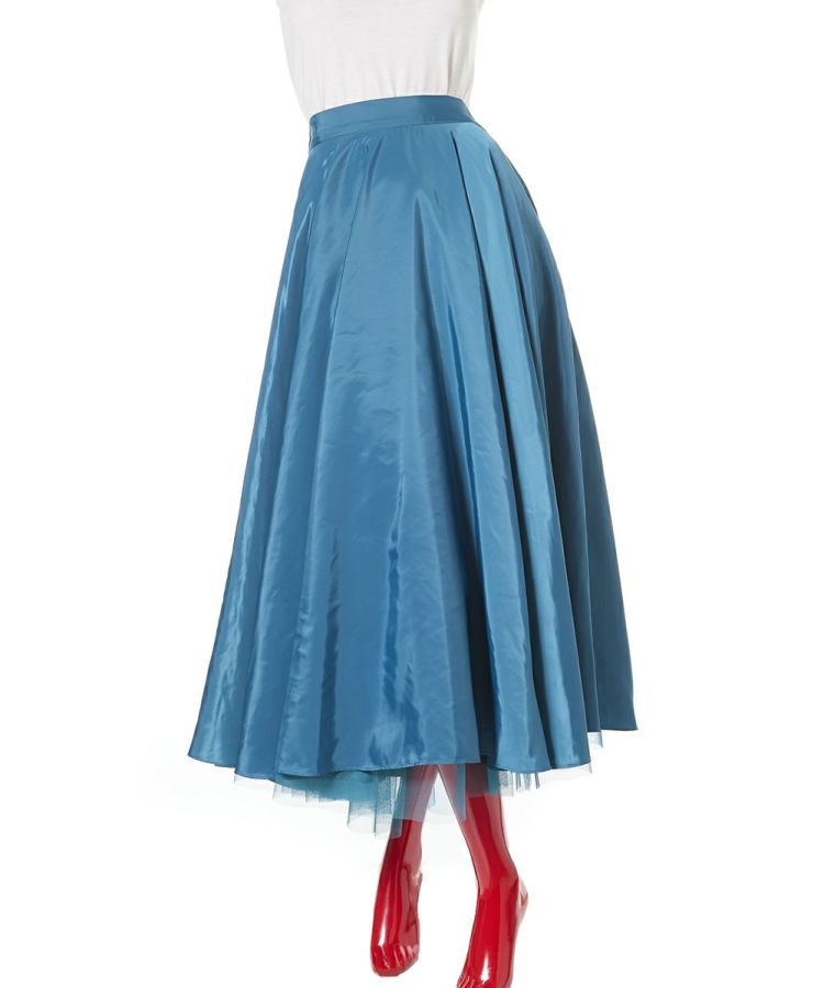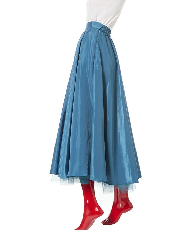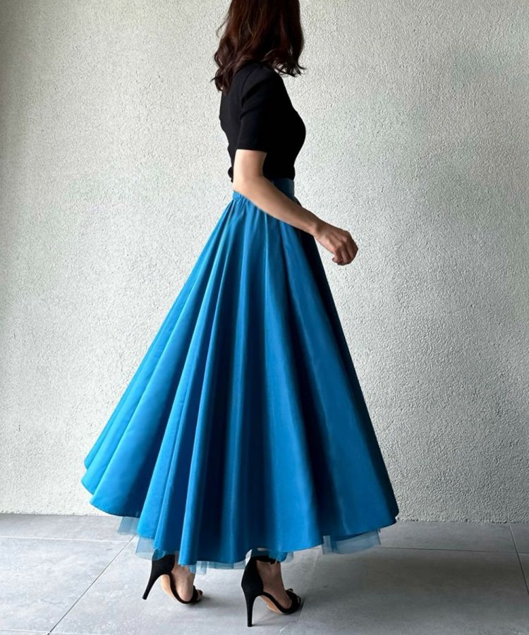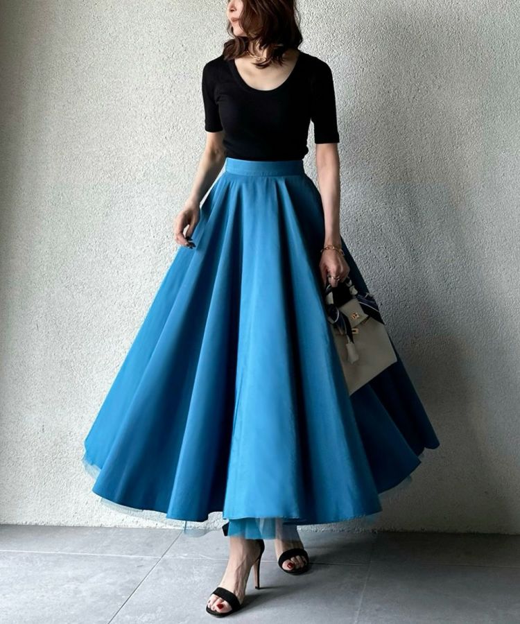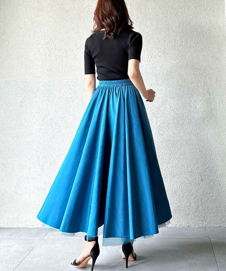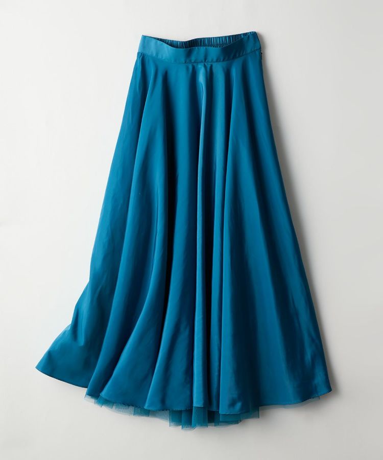 鮮やかで爽やかなカラーリングと光沢感が美しいロングスカート。裾から見えるチュールの透け感が歩くたびに足元をきれいに演出してくれるのもポイント。ギャザーをたっぷり寄せて縦のラインが強調されるため、全身のシルエットをすっきりと見せてくれるのも魅力です。