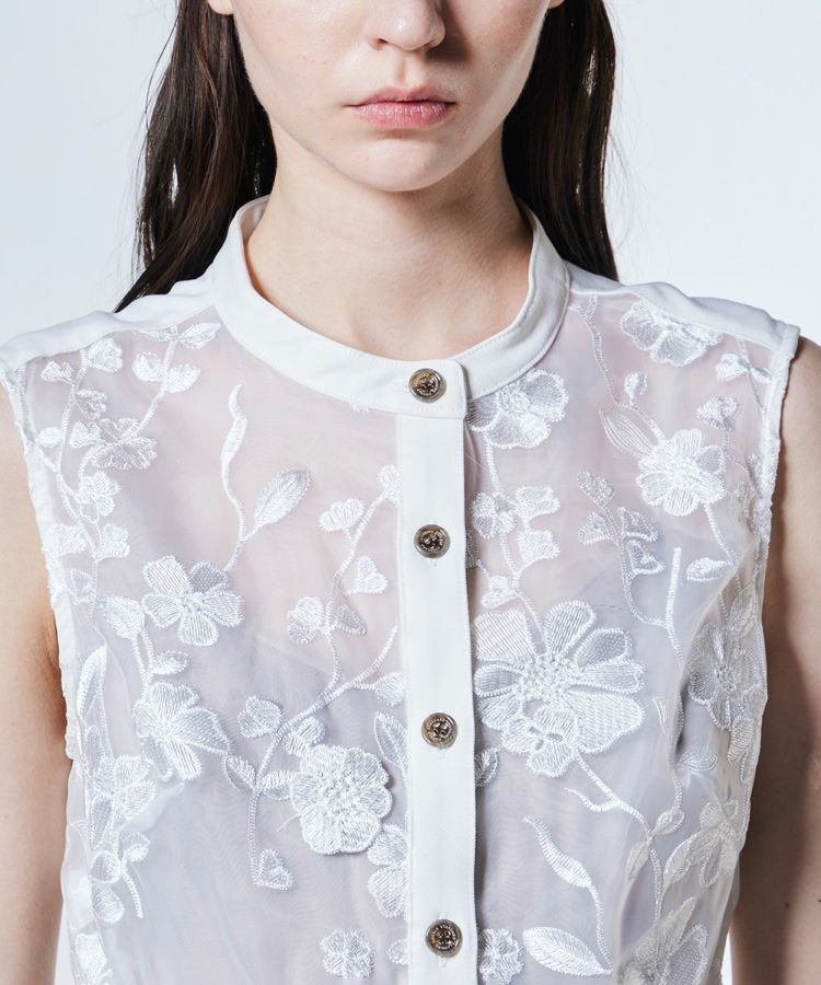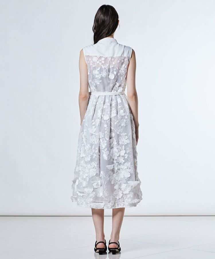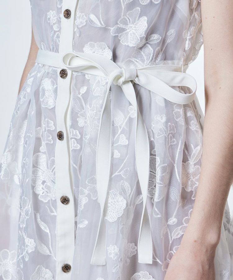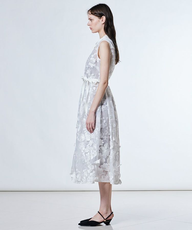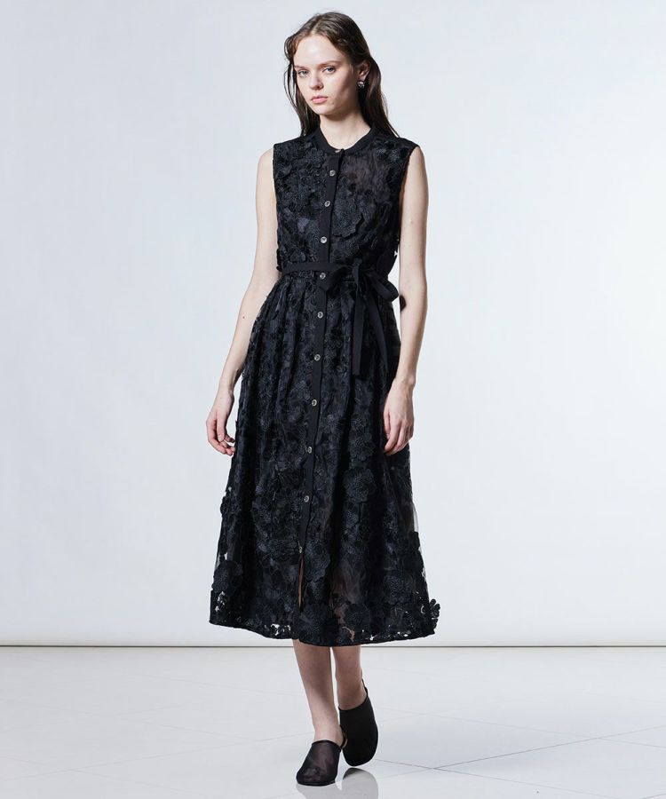 上品な透け感で程よい肌見せが叶うワンピース。立体的な花柄刺繍を全体的に散りばめて、華やかな印象に仕上げました。ウエストのリボンがアクセントになり、メリハリのある女性らしいシルエットを演出。カラーは、使いやすいオフとブラックで展開し、特別な日のお出かけやオケージョンシーンにも映えます。