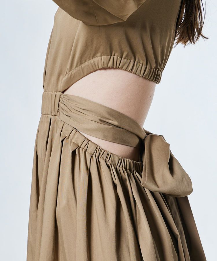 ふんわりとしたパフスリーブとウエストのリボンが女性らしさを引き立てる、フェミニンなワンピース。シンプルなデザインながらも、大胆に腰まわりを見せるカッティングで、ヘルシーな肌見せを実現しました。ストレッチ性に優れたブロード素材で快適な着心地をキープ。一枚でエレガントな佇まいを演出してくれる大人のワンピースです。