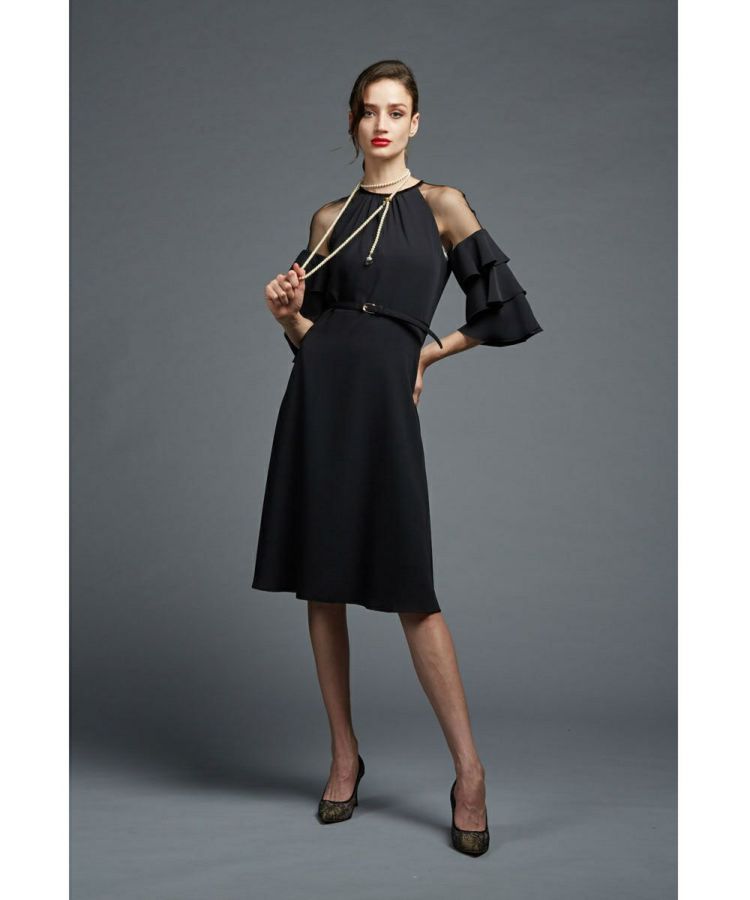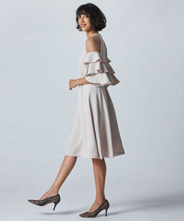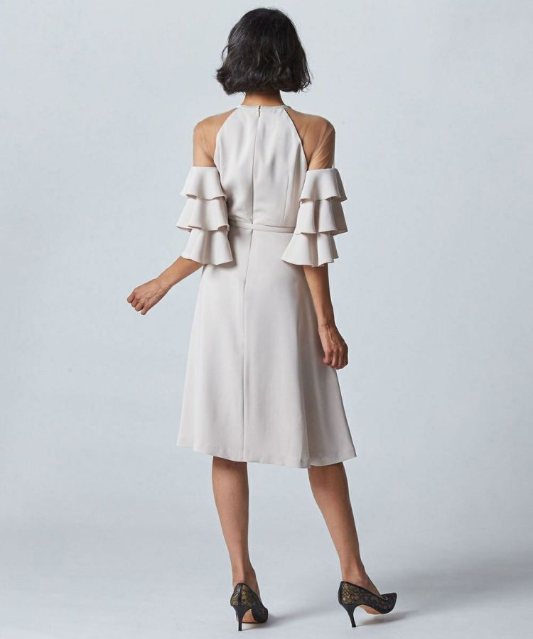今季のパーティーシーズンに活躍するワンピース。ホルターネックに見えて実はチュールに切り替えているという、斬新かつ遊び心が効いたデザインです。旬のディテールを大人のテイストで魅せるところがSov.ならでは。ウエストを付属の細ベルトでマークする、女性らしいフィット&フレアーのシルエットです。袖部分の大胆なフリルは、気になる二の腕部分もカバー。スカート部分もヒップから太ももにかけてのラインをフェミニンに演出します。