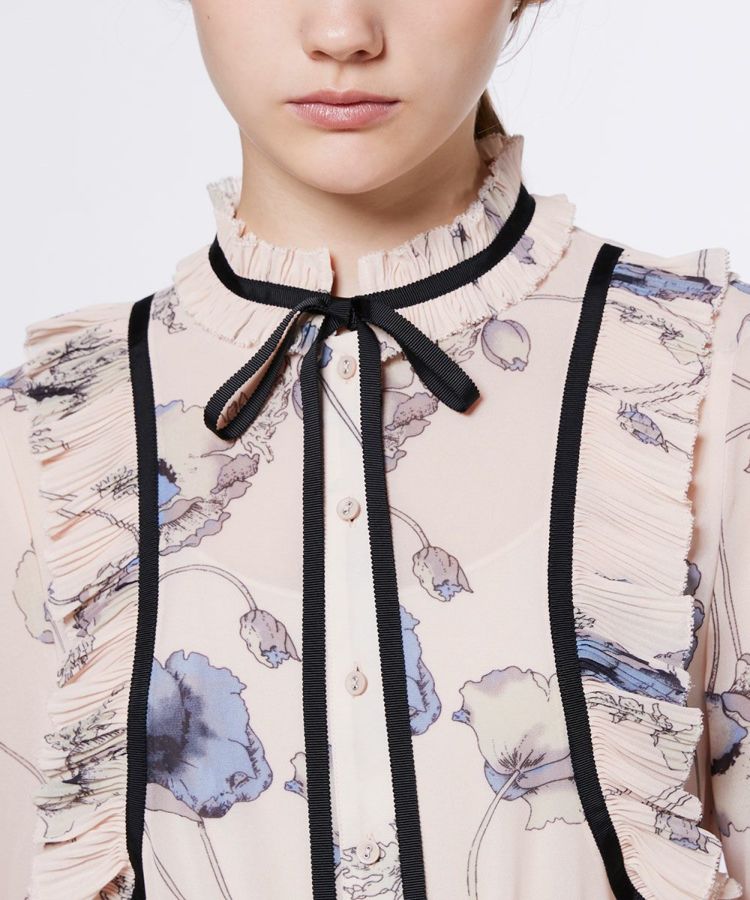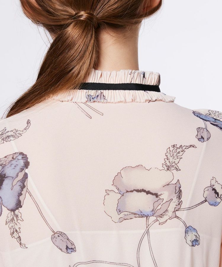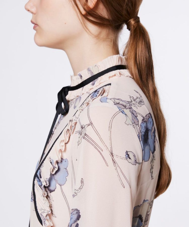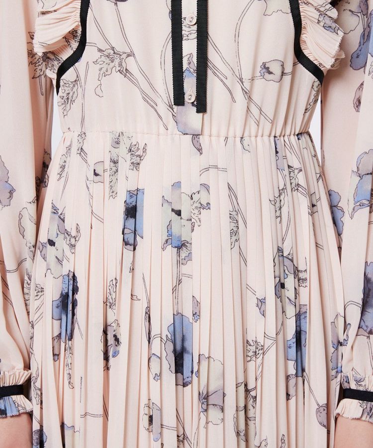 柔らかな落ち感のあるオリジナル生地に繊細なプリントを施した、大人の魅力あふれるワンピース。淡い柄に映える黒の細リボンが、全体を引き締めて、メリハリのある印象に仕上げました。スカートには繊細なプリーツを施し、エレガントな雰囲気を演出。1枚でコーディネートが完成する、Sov.らしい大人かわいい主役ワンピースです。