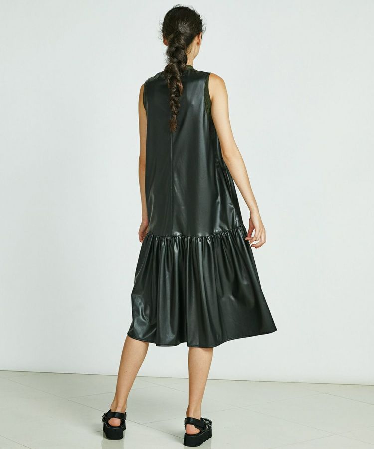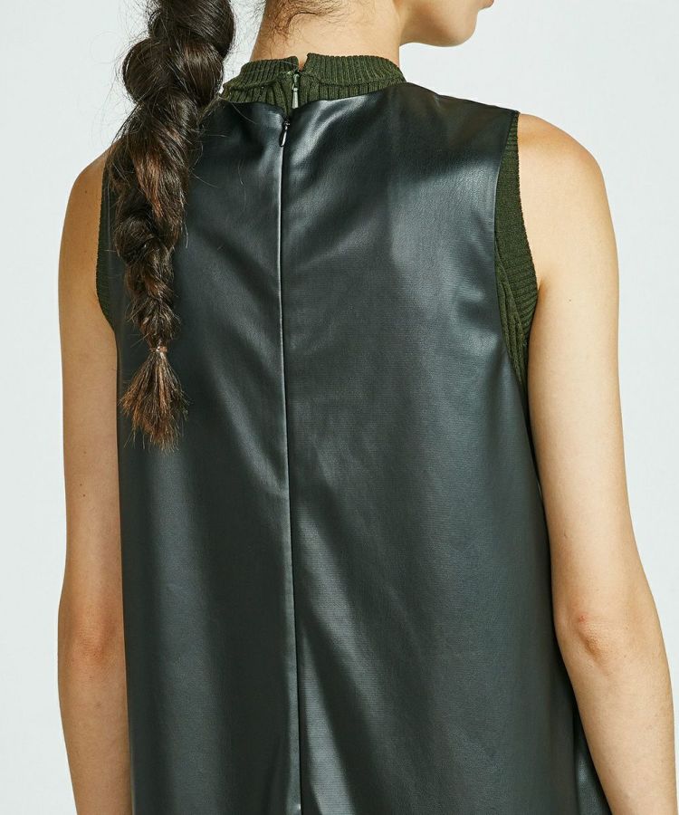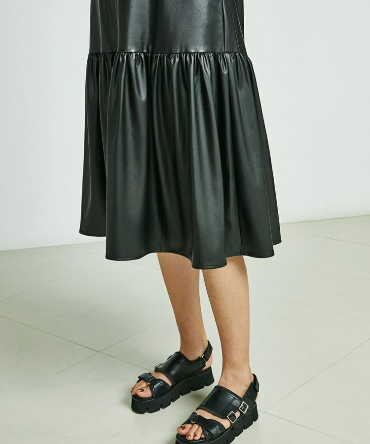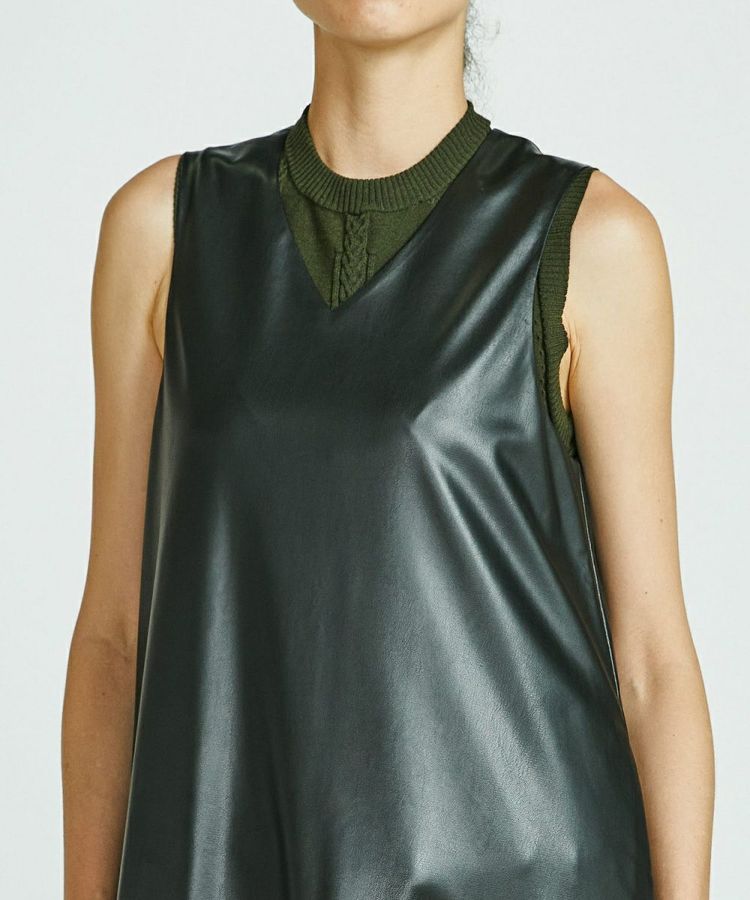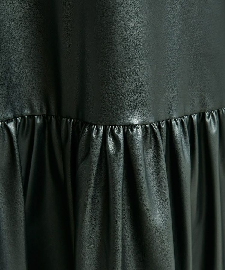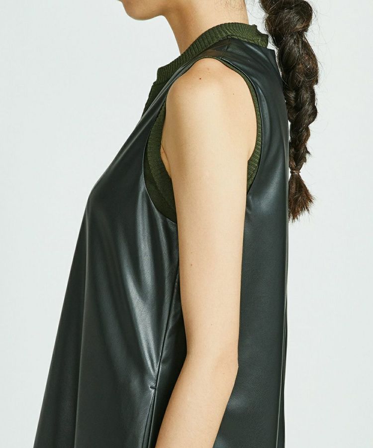 レザーライクな光沢感が目を引く、大人モードなジャンパースカート。エッジの効いた素材に、ふんわりと広がるAラインシルエットを組み合わせ、シンプルながらも印象的な一着に仕上げました。1枚でさらりと着てスニーカーを合わせれば、抜け感のあるカジュアルスタイルに。深めのVネックデザインなので、タンクトップやタートルネックとのレイヤードも楽しめます。