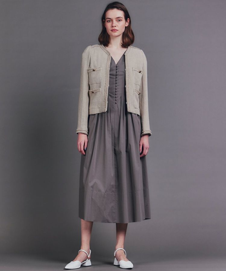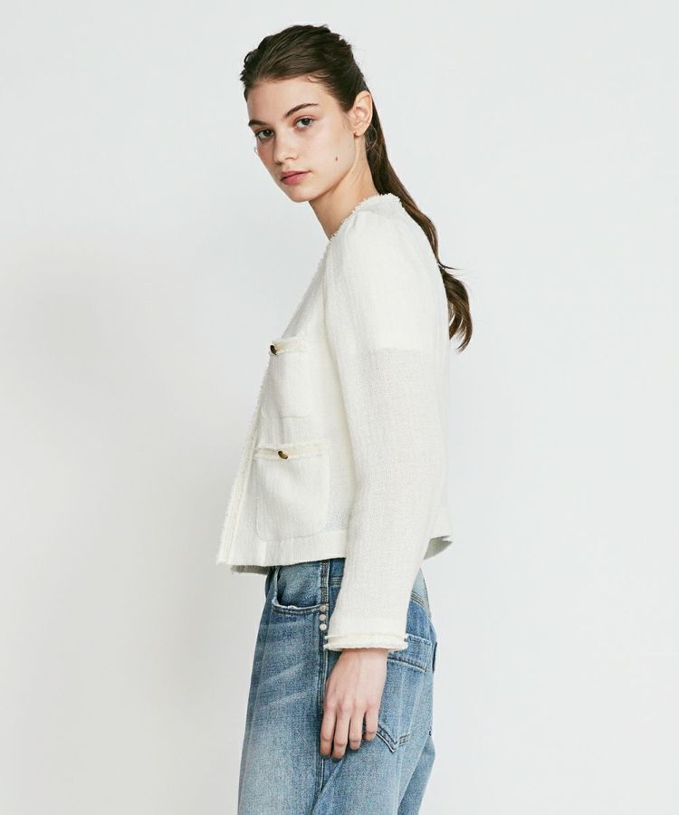 ドビー組織の表情を際立たせたジャケット。リネンラミー双糸強撚糸とリネン3本撚りの糸を使用、染色過程で解撚手法を施した生地を密度を甘くして撚りあげることでもみほぐし、加工で柔らかさと膨らみをプラス。こだわりの詰まった、素材が活きる一着に仕上がりました。ノーカラーなのでカジュアルコーデにも取り入れやすいのも魅力です。
