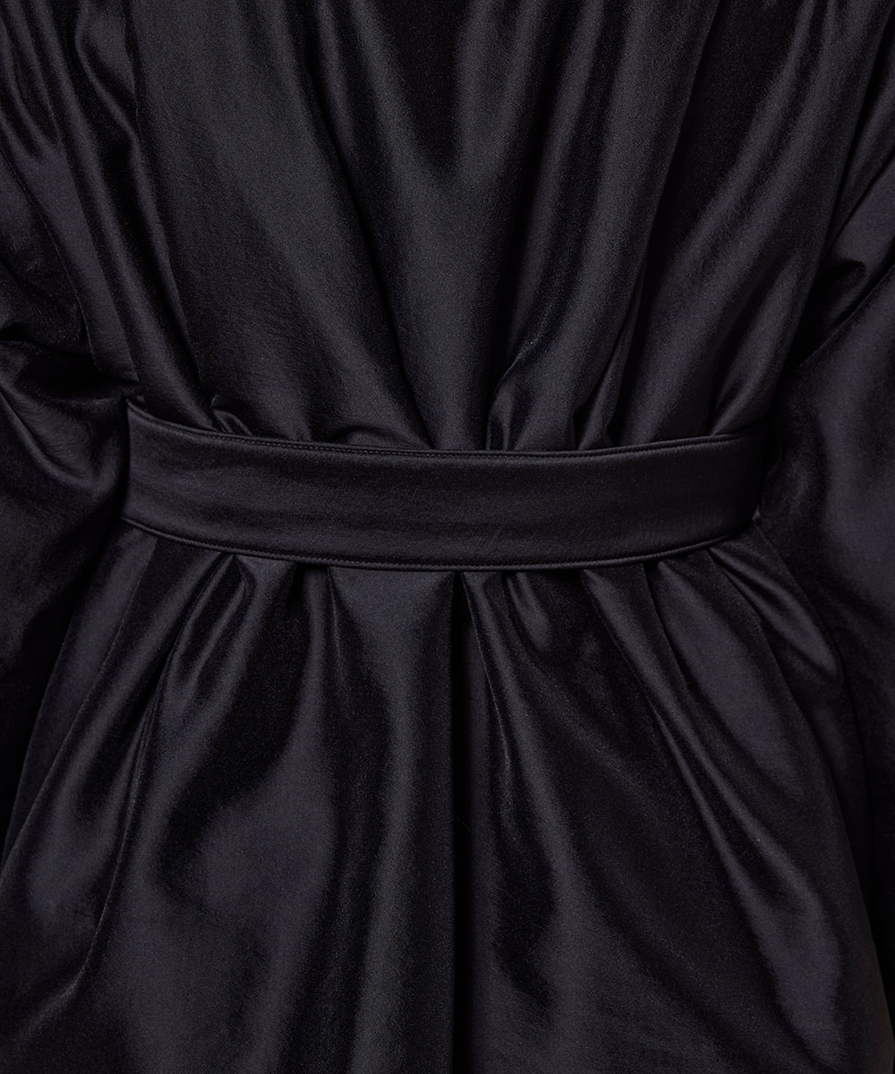 美しい光沢感が上品な印象を与えるエレガントなジャケット。ウエストにベルトをあしらうことで、女性らしいシルエットを際立たせました。カラーは、柔らかくフェミニンな雰囲気のオフホワイトと、洗練されたクールなブラックの2色展開。ボタンを開ければ抜け感のあるリラックススタイルに、締めればきちんと感のある端正な装いにと、シーンに合わせて表情を変えて楽しめる一着です。