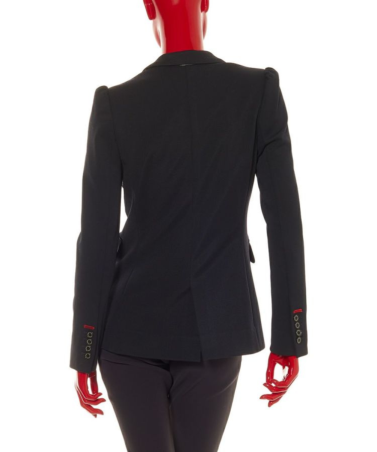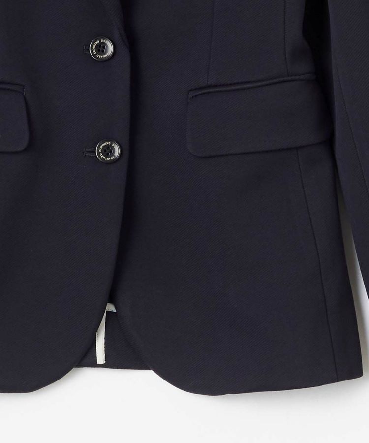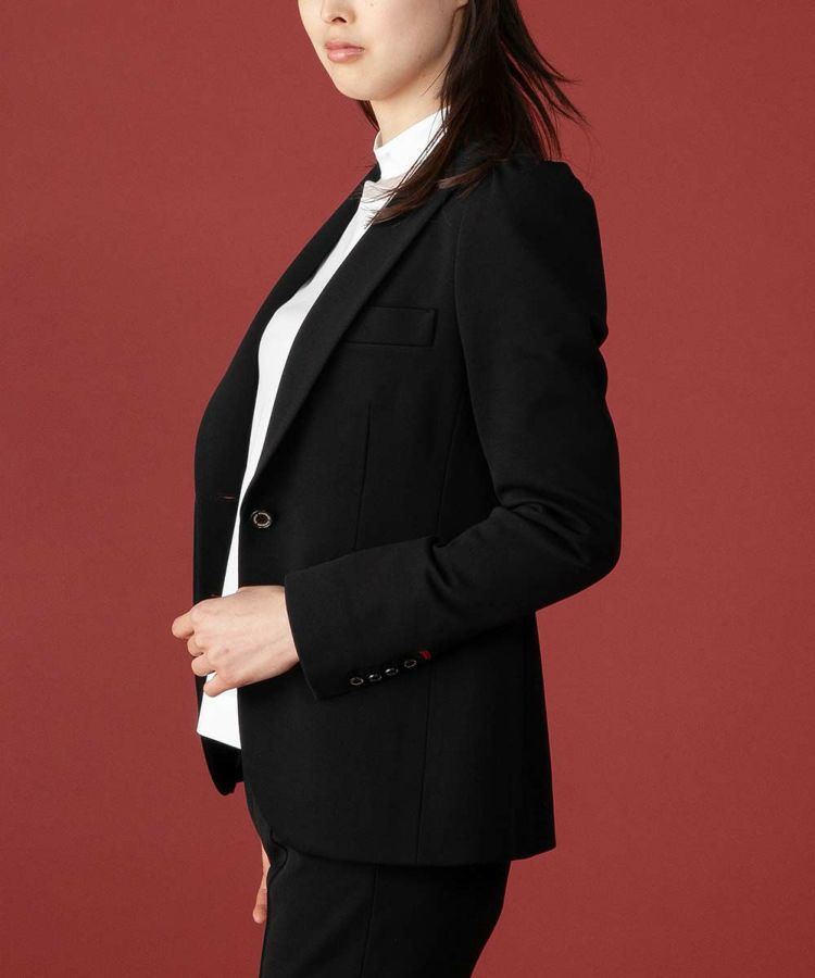 ほどよく肉感のあるジャージ素材で、ウエストをシェイプさせた綺麗なシルエットをしっかりと表現。ドライな風合いもエレガントな空気感を作り出す要素です。肩部分にギャザーを寄せ、ほんのりクラシカルでフェミニンなディテールにアレンジ。すっきりと着られるので着まわし力も抜群。カフス部分の赤ステッチや襟裏の別布使いもさりげないポイントです。
