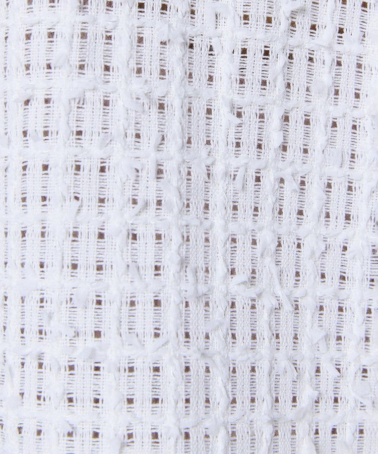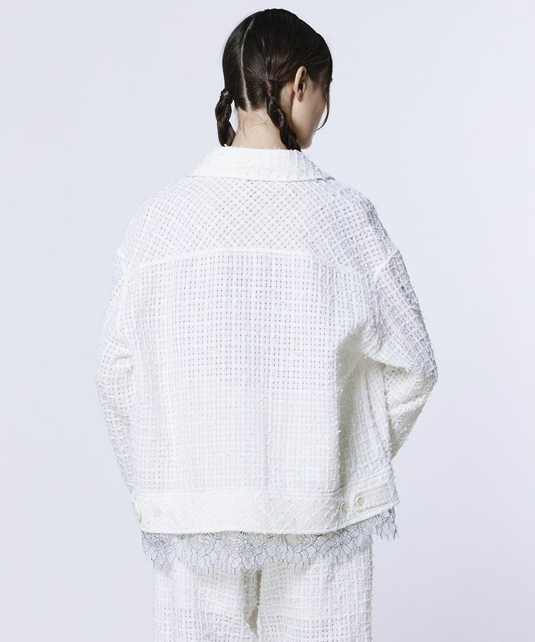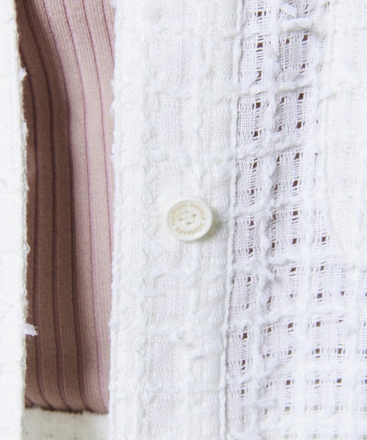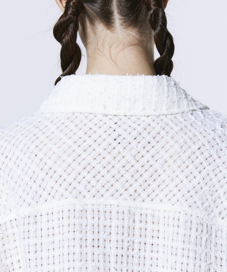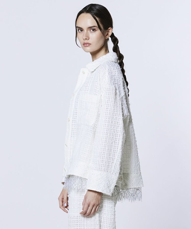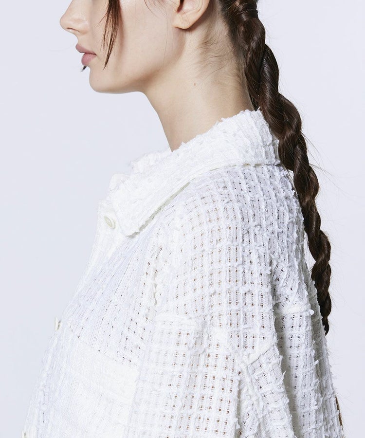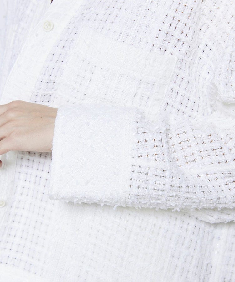 独特な表面感のファンシーツイードが、高級感のある佇まいを演出するジャケット。程よい透け感のある素材が、さりげない肌見せで女性らしさを引き立てます。ボタンを留めればシャツ感覚で上品に、開けて羽織ればこなれた印象に。着こなしの幅が広く、同素材のパンツ(型番:0306361261)と合わせれば、洗練されたスタイリッシュなセットアップスタイルが完成します。