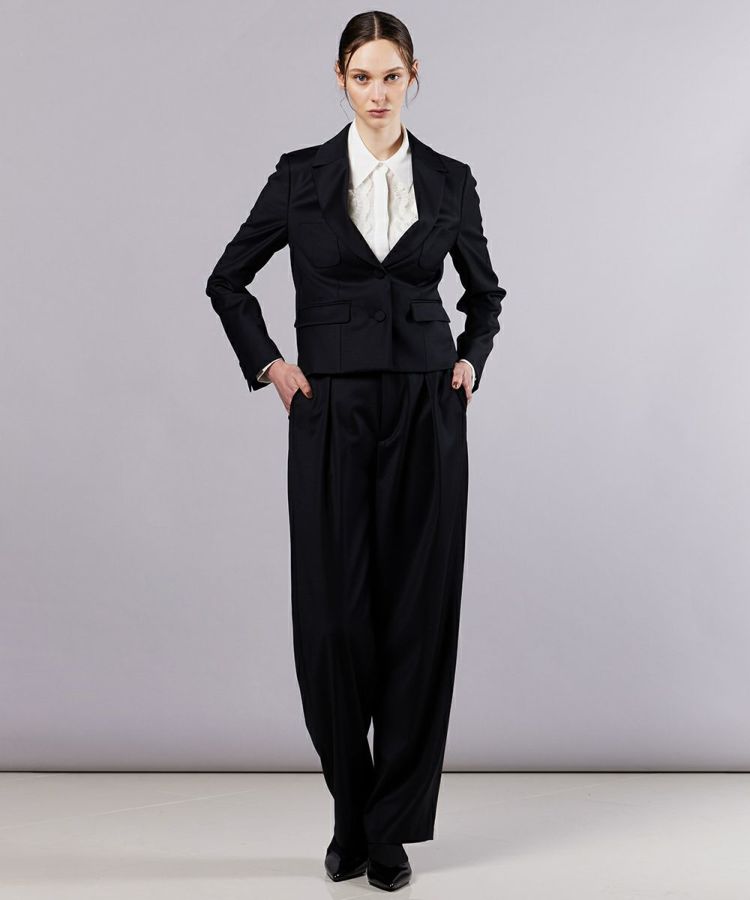 なめらかな手ざわりと上品な光沢感が際立つ、ウールとシルクの混紡糸を使用したジャケット。ウエストを絞った美しいシルエットがメリハリを生み、着るだけでスタイルアップが叶います。ショート丈のデザインはどんなボトムスとも合わせやすく、コーディネートの幅が広がるのも嬉しいポイント。ビジネスシーンはもちろん、フォーマルなオケージョンシーンにもぴったりです。