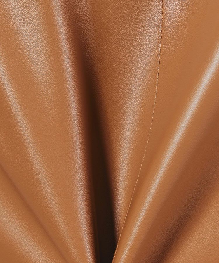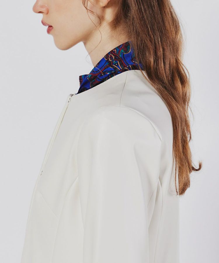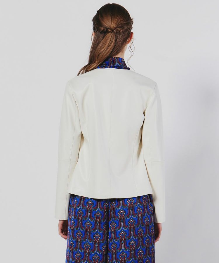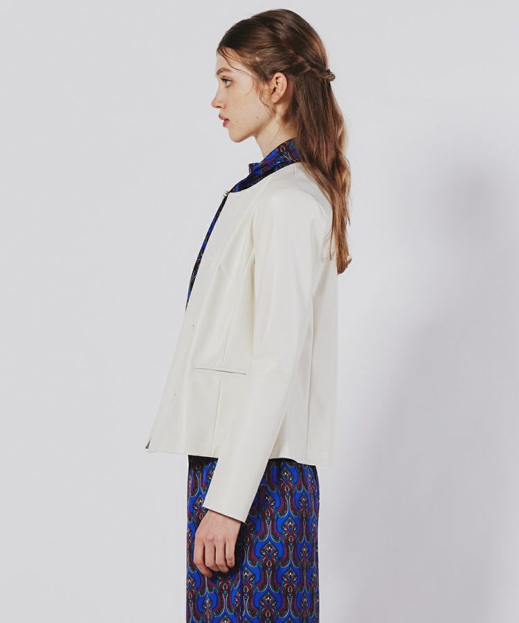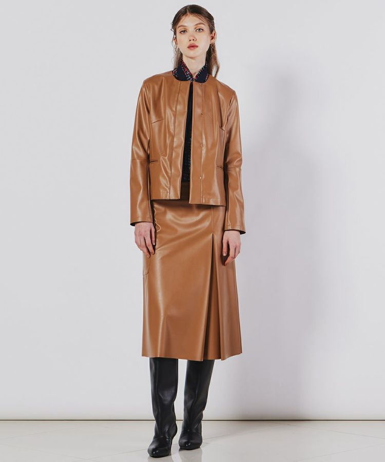 ハードになりすぎず、フェミニンに着こなせるノーカラータイプのフェイクレザージャケット。カジュアルなパンツにも、上品なワンピースにも合わせられるのが魅力です。また、本革よりもぐんと軽やかなのもうれしいポイント。一着備えておくと、季節の変わり目の羽織として重宝するアイテムです。