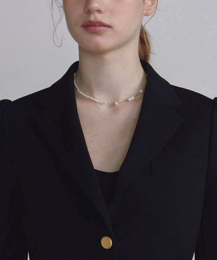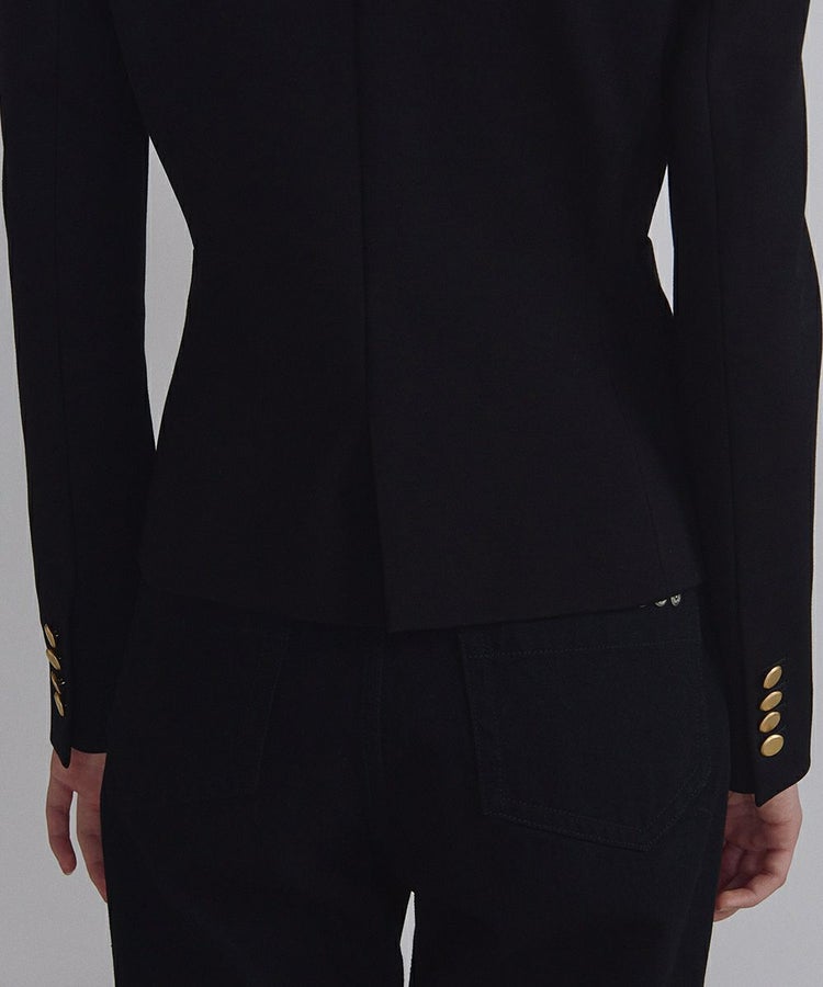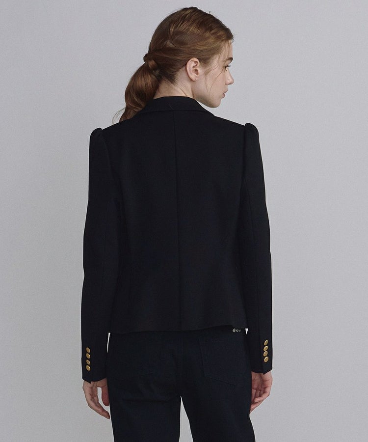 コンパクトでフェミニンなシルエットで仕立てたテーラードジャケット。襟は細身にすることで軽やかでスタイリッシュな印象に仕上げています。パワーショルダー仕様にすることで、さりげないエッジをプラスし女性らしくもクールな着こなしを実現。全身のスタイルが決まりやすく、都会的なムードのある一着です。金色のボタンがクラシカルなアクセントをプラスしています。