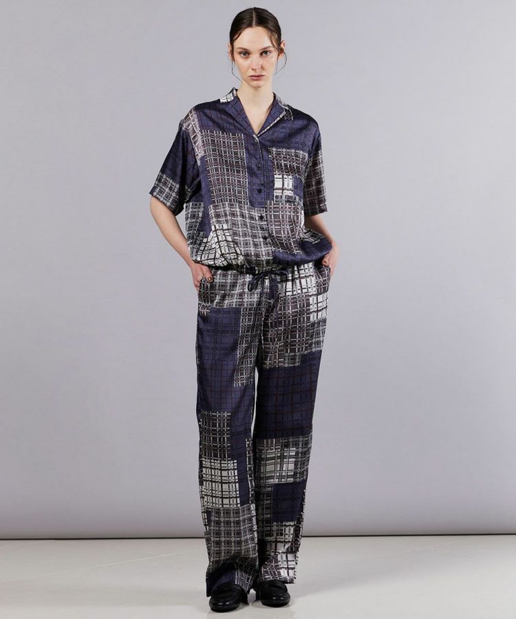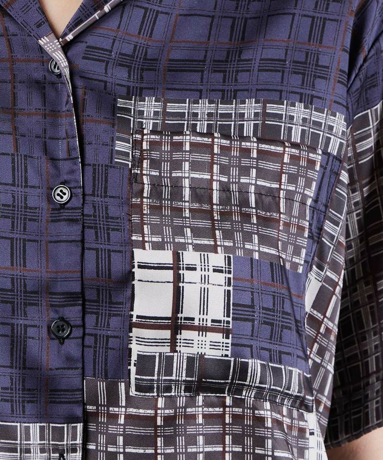 上品な光沢となめらかな手ざわりが魅力のポリエステルサテン素材を使用したシャツ。オリジナルのチェック柄をパッチワーク風に配置し、エッジを効かせた一着に仕上げました。裾はドローストリング仕様でシルエットの調整が可能。同素材のパンツ(型番:0306221253)とコーディネートすれば、一味違う大人のセットアップスタイルを楽しめます。