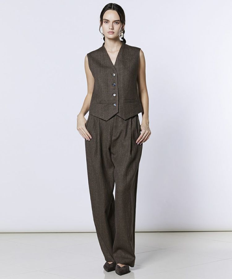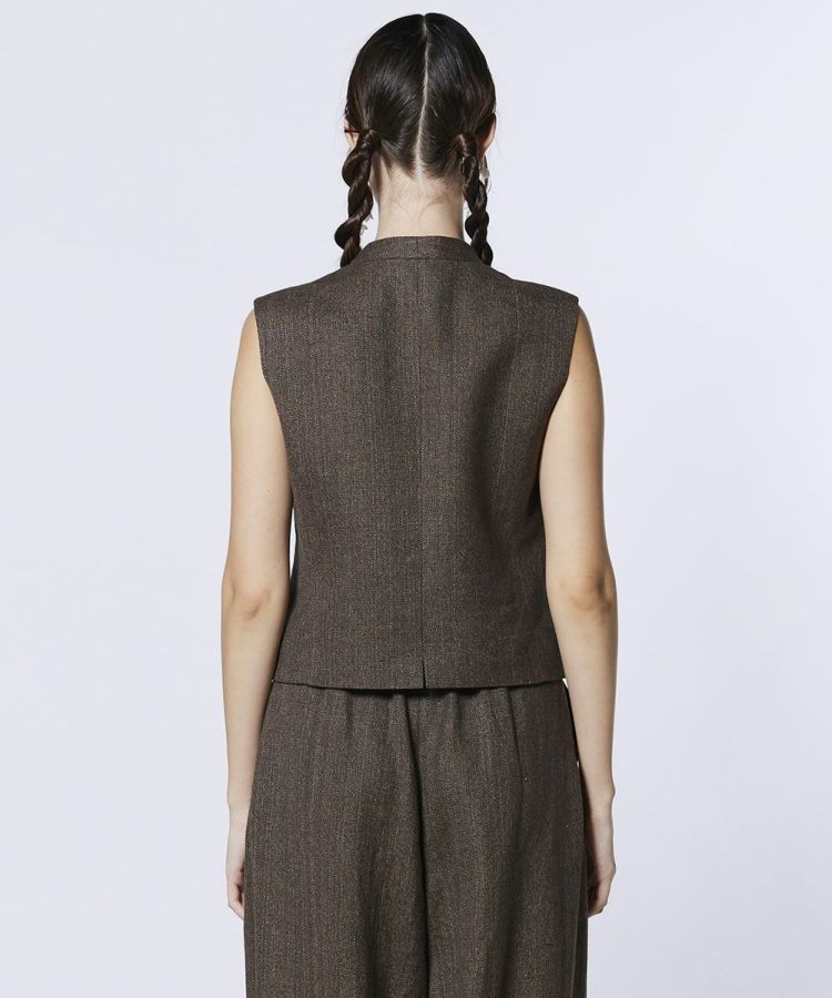ハリ感のある素材が上品な佇まいを演出するジレ。シャツとのレイヤードはもちろん、1枚でさらりと着こなせばヘルシーな肌見せも楽しめます。カラーは着回し力の高いオフホワイトとブラウンの2色展開。同素材のイージーパンツ(型番:0306241261)と合わせれば、春夏らしい軽やかなセットアップスタイルが完成します。