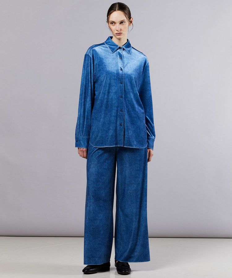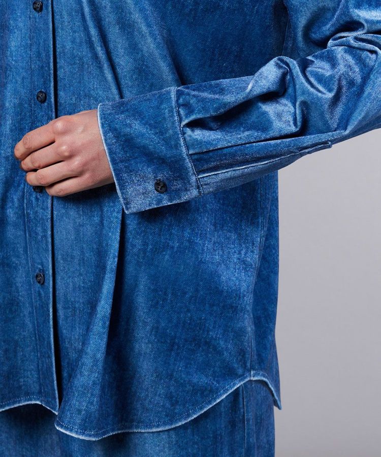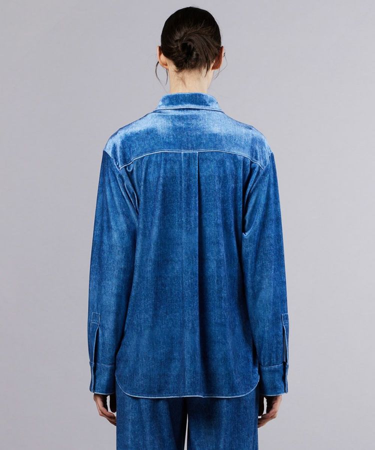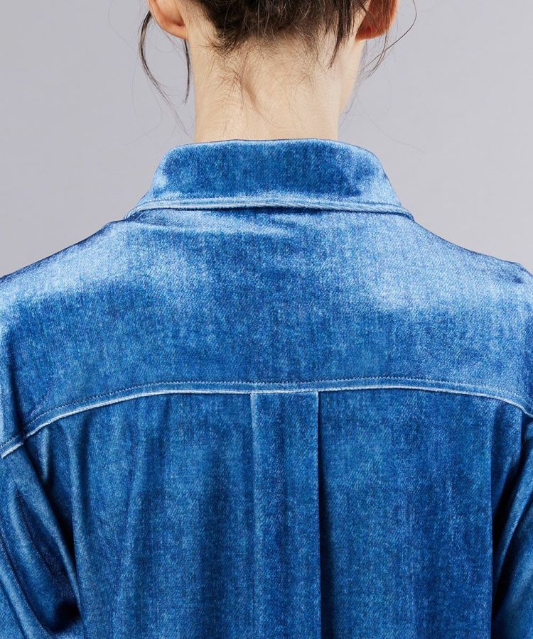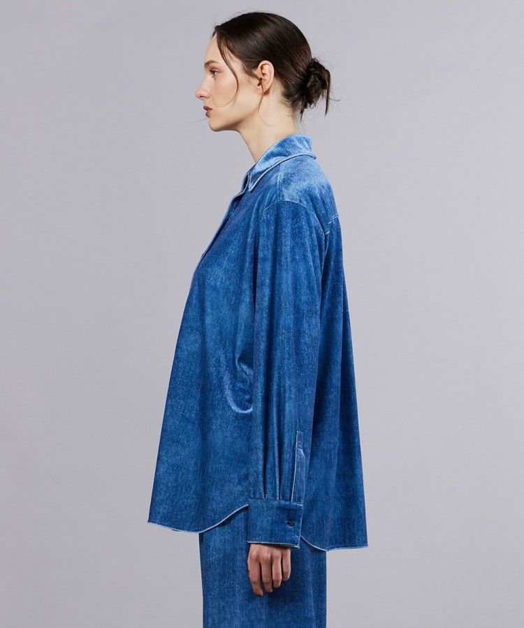 均一な起毛感が美しく表情豊かなベロア素材に、デニム生地をプリントした個性派シャツ。柔らかな肌ざわりで着心地が良く、長時間着用しても快適に過ごせます。ゆったりとした丈感が体型をさりげなくカバーし、気軽にトレンド感のあるスタイルを楽しめるのも高ポイント。同素材のパンツ(型番:0306461253)と合わせれば、大人の雰囲気漂うセットアップコーデが完成します。