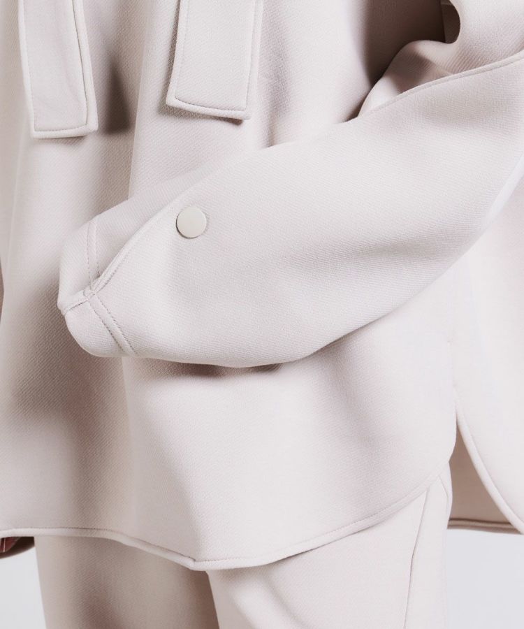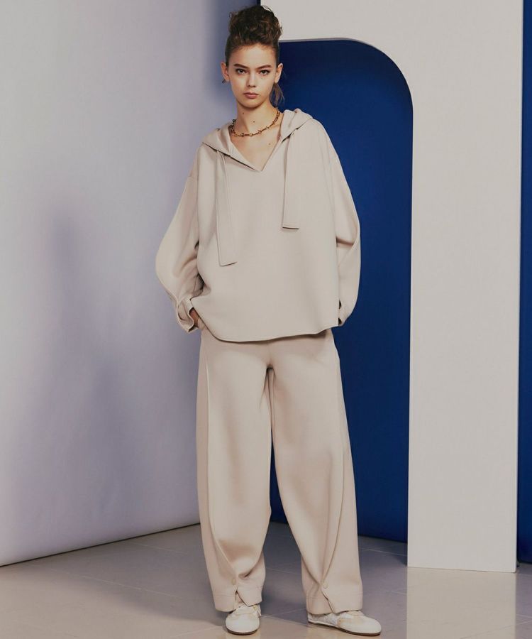 独特の膨らみ感となめらかな表面感が特徴の、ダンボールニットを使用したパーカー。布帛(ふはく)のようなしっかりとしたツイル目の組織感も特徴になっています。また、ダンボール素材でありながらとろみと落ち感があり、エレガント。立体感を出したデザインもユニークで、シンプルながらも、シルエットと質感で着映えが叶うアイテムです。同素材のパンツ(型番:0306111244)とセットアップで着用するのもおすすめ!