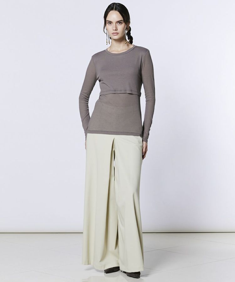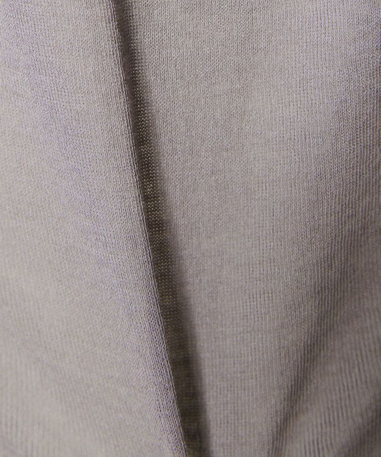 1枚でレイヤードしているように見えるデザインが魅力のトップス。程よくシアー感のある素材が、女性らしくセンシュアルな雰囲気を添えます。カラーは使い勝手の良いオフホワイトとブラック、肌なじみの良いグレージュの3色展開。シンプルながらも表情のある一枚で、デイリーからオフィスカジュアルまで幅広いシーンで活躍します。