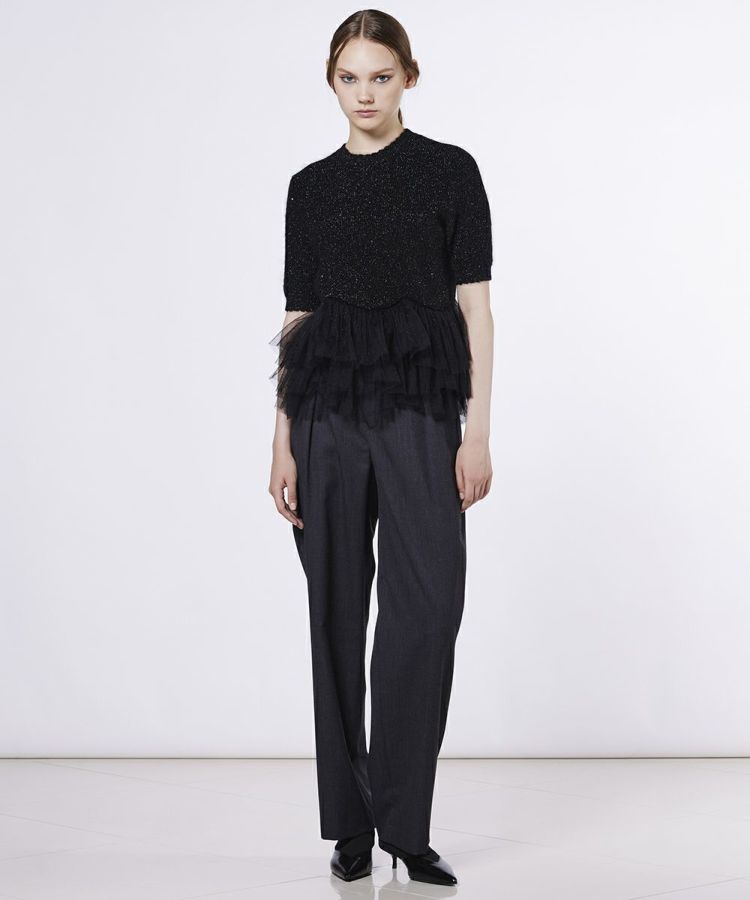 ボリューム感のあるチュールペプラムをあしらった、華やかなニット。ふんわりと柔らかなモヘア素材を使用し、肌ざわりの良さと快適な着心地を叶えました。ティアード調のペプラムは腰まわりをさりげなくカバーし、スタイルアップも期待できるデザイン。同系色のパンツを合わせれば、簡単に大人モードなスタイリングが完成します。