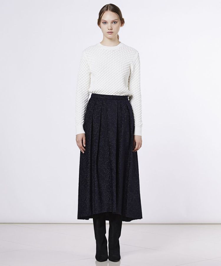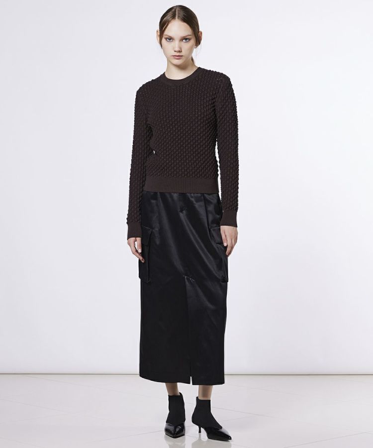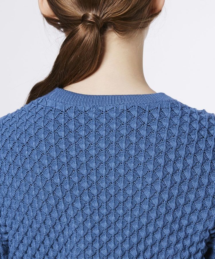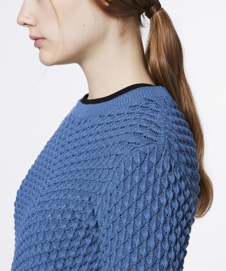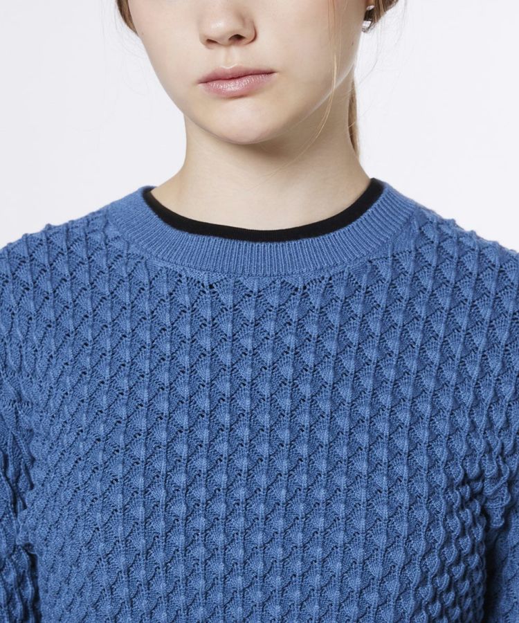 ダブスタ定番のSNOWY糸を使用したクルーネックニット。独特なポップコーン編みで立体感を加えることで、シンプルながらも奥行きのある表情に仕上げました。絶妙な丈感は、デニムからスカートまで幅広いボトムスと好バランス。カラーは、どんなスタイルにも馴染むオフホワイトとダークブラウン、差し色として活躍するブルーの3色展開で、スタイルに合わせて好きなカラーを選べるのも魅力です。
