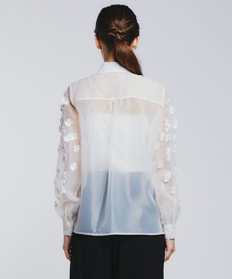 上品な透け感がフェミニンな印象を与えるオーガンジーのブラウス。立体の花柄モチーフをプラスし、デザイン性を高めました。さらに大ぶりのボウタイがアクセントになり、一枚でもインパクトたっぷり。また、ゆったりとしたシルエットなので、さりげなく体型カバーできるのうれしいポイントです。ボウタイを外し、フロントのボタンをあければシャツカーディガンに早変わり。ロングシーズン楽しめるアイテムです。