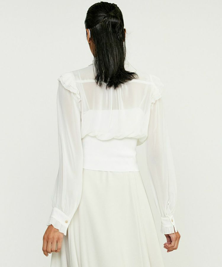 たっぷりのフリルと上品なシアー感がフェミニンな印象を与えてくれるブラウス。シフォンクリスタルプリーツをギャザーフリルに、端はピコ刺繍で仕上げるなど、贅沢なデザインディテールも魅力です。ゆったりと優雅なシルエットの袖に対し、ウエストはリブ編み仕様でメリハリを効かせているのがポイント。上半身が華奢見えすることで、全身のスタイルアップ効果がアップする一枚です。パンツスタイルにも、スカートに合わせても着映えします。