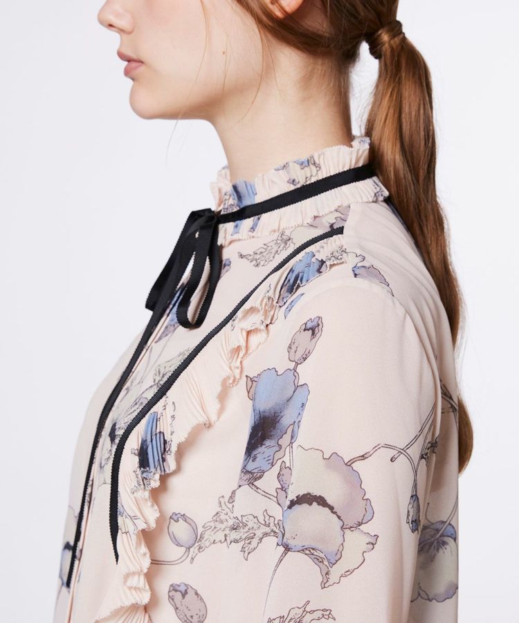 柔らかな落ち感のある生地に繊細なプリントを施した、Sov.オリジナルの上品なブラウス。淡いプリント柄に黒の細リボンを効かせることで、全体を引き締め、大人の洗練された雰囲気を演出します。胸元やネックラインにあしらったフリルが、さりげない華やかさをプラス。シンプルなボトムスと合わせるだけで、品のあるスタイリングが完成し、オン・オフ問わず幅広く活躍する一枚です。