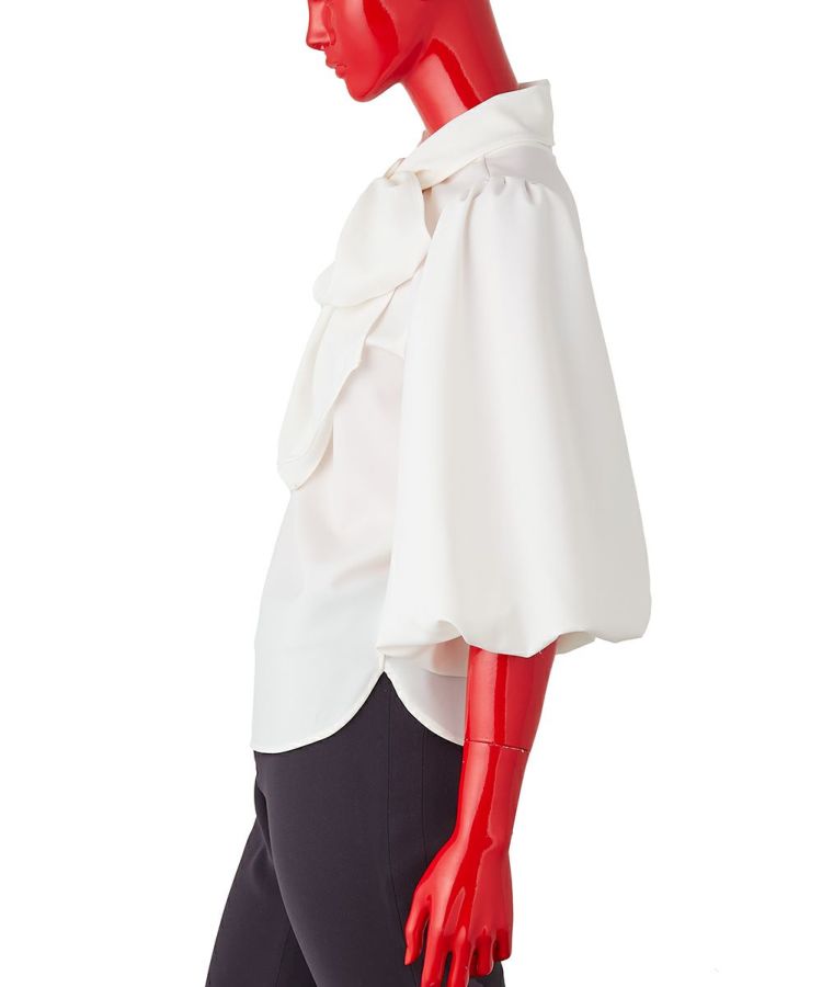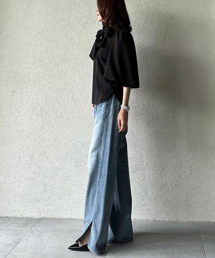 ふんわりとしたパフスリーブと、優雅なドレープが手元を美しく見せてくれるブラウス。きちんと感のあるハイネックに、大ぶりのリボンがフェミニンなアクセントを添え、甘さと品のよさを両立しました。さらりとした肌ざわりと、なめらかな表面感が上品さを引き立て、着るだけで華やかな印象に。デニムを合わせて大人カジュアルに、タイトなスカートを合わせてオケージョンにと、幅広いシーンで活躍するアイテムです。