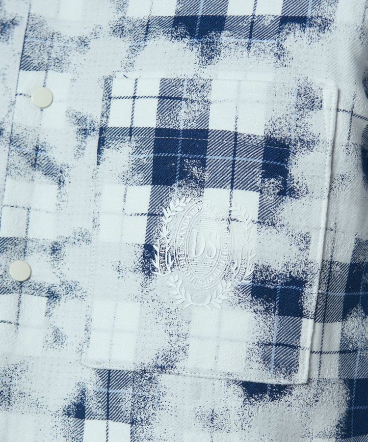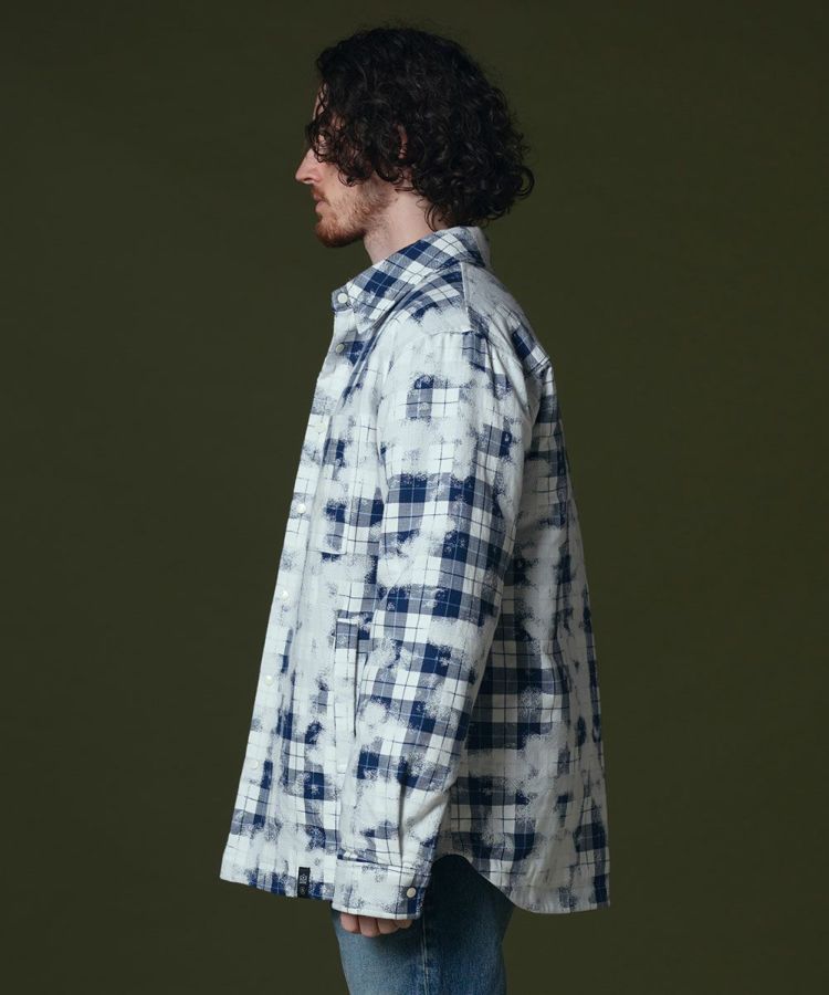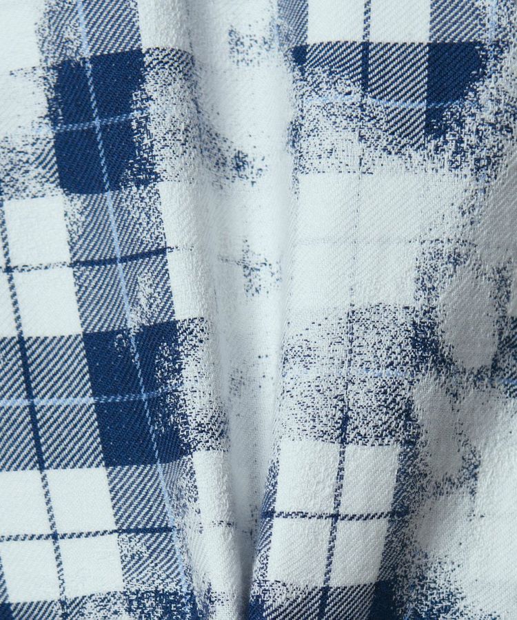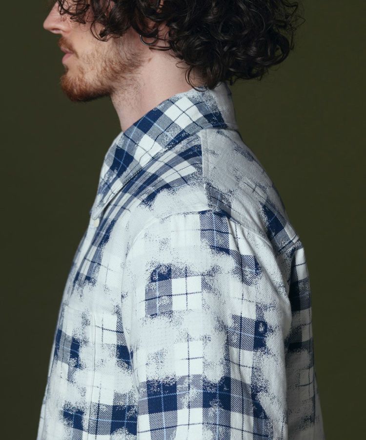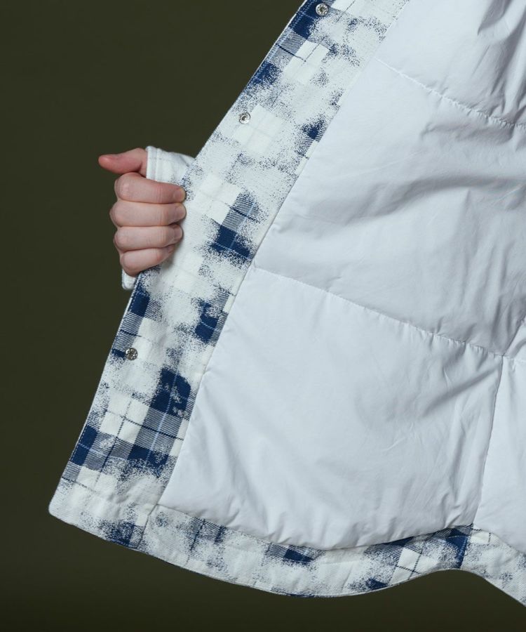 爽やかなマドラスチェックの柄のシャツに中綿を入れ、程良いボリューム感を出したジャケット。ぼかしたようなホワイトのダメージ加工をプラスし、唯一無二のデザインに仕上げました。着用感も雰囲気も軽やかで、重くなりがちな冬のコーディネートに一石を投じてくれるアイテム。Tシャツの上からさっとシャツ感覚で羽織るだけでオリジナリティのあるコーディネートが完成します。