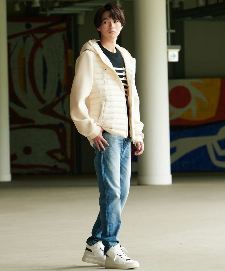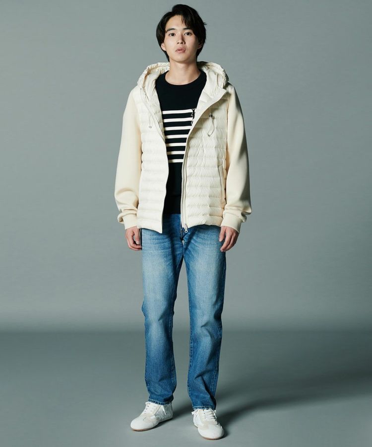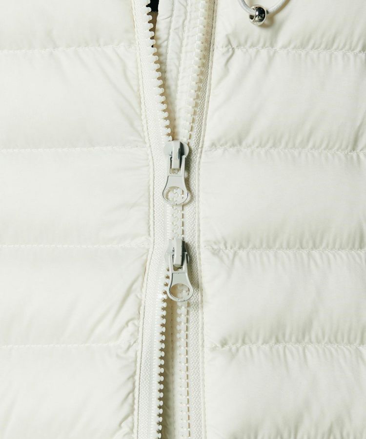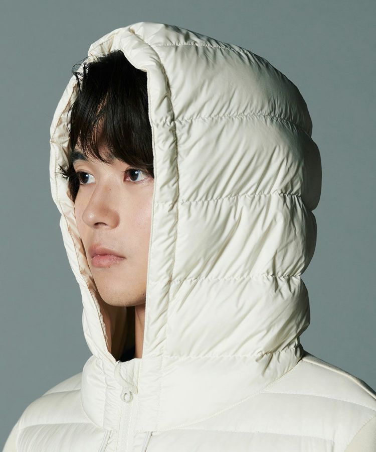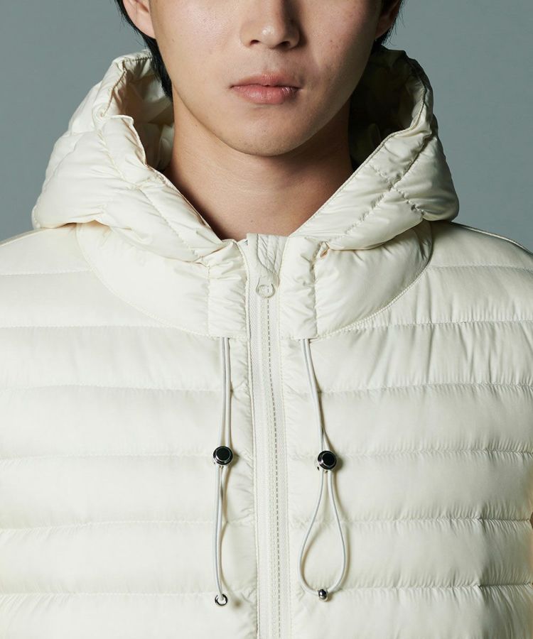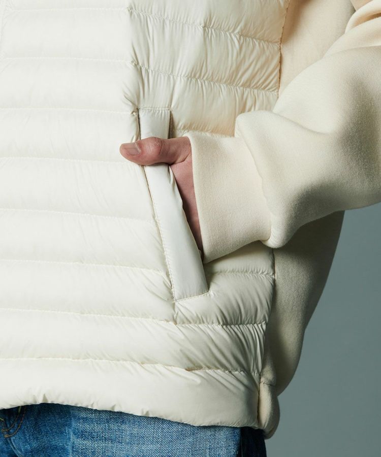 軽やかな着心地でもしっかりと暖かい、ダウン90、フェザー10の羽毛を採用したダウンジャケット。タフタ素材とダンボール生地をドッキングした、スポーティーなルックスが魅力です。一枚でアウターとして着るのはもちろん、真冬にはコートのインナーとしても心地良い柔らかさ。シンプルなデザインとコンパクトなフォルムで、着まわし力は抜群です。
