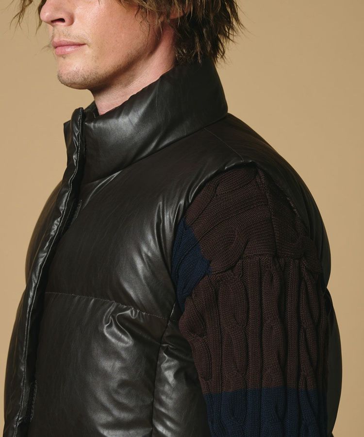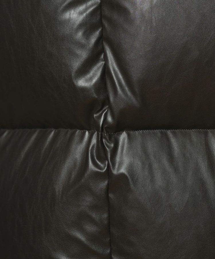 ヴィンテージライクな風合いが魅力のフェイクレザーを使用したダウンベスト。中綿にはたっぷりとフェザーを詰め込み、優れた保温性を実現しました。ボリュームのあるデザインながらも、クロップド丈のコンパクトなシルエットで、カジュアルすぎずきれいめな印象に。スラックスやワイドパンツなどのボトムスとも好バランスで、こなれ感のあるスタイリングが楽しめます。