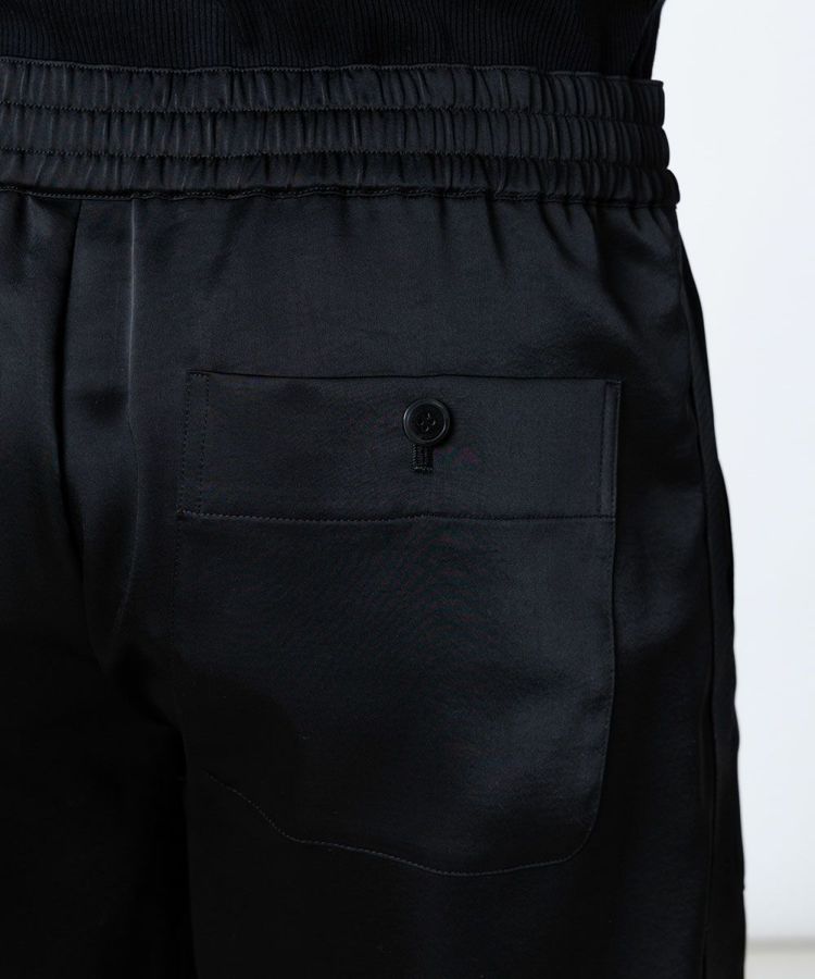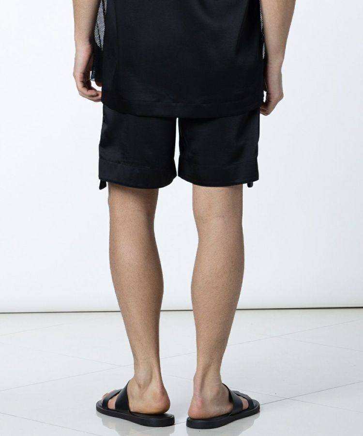 アセテート風サテンの質感が上品なショートパンツ。脇のラインがポイントになり、リラクシンでありながらドレス感があります。ポケットや折り返しのデザイン、コンパクトなフォルムもカジュアルになりすぎないポイント。Tシャツに合わせてもきれいめな印象を与えてくれます。ウエストはゴムで、穿き心地は楽チン。