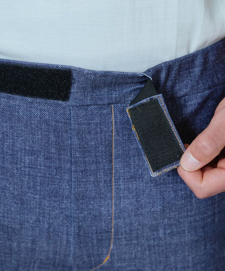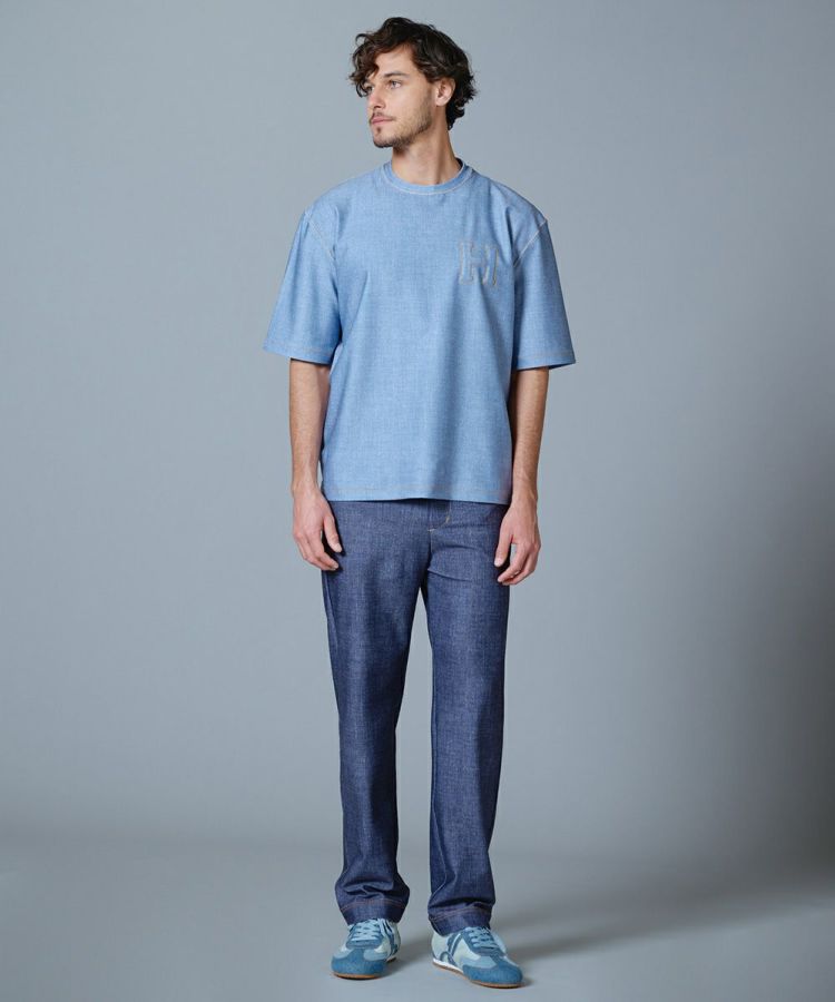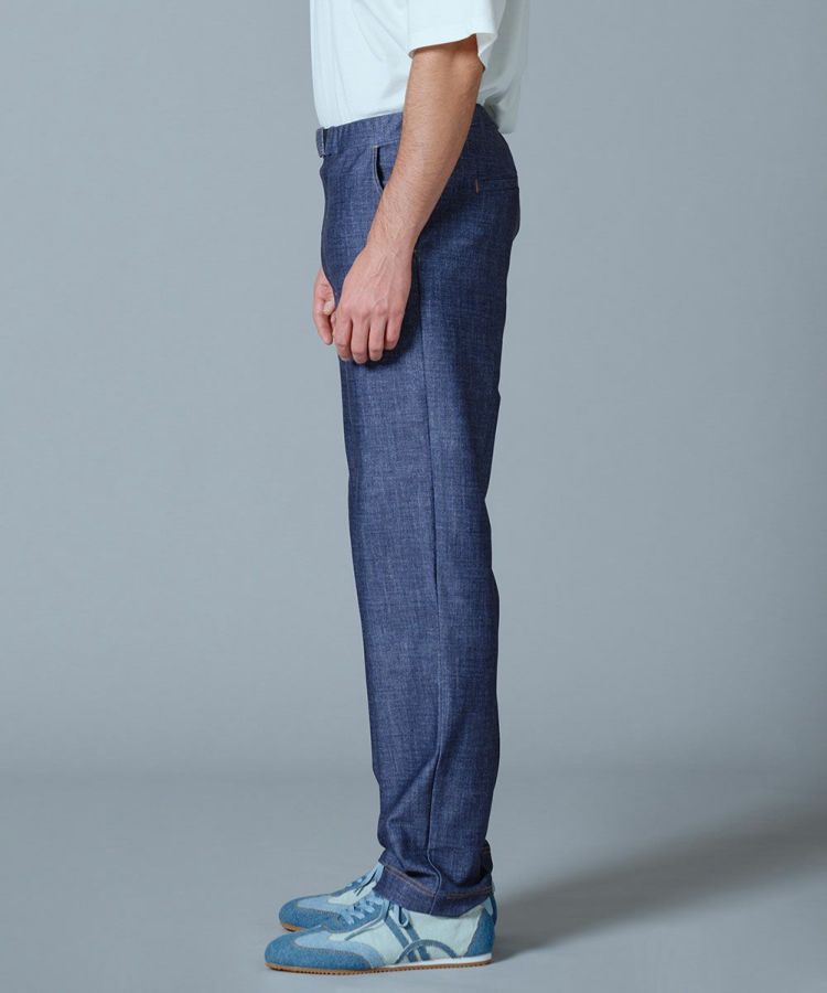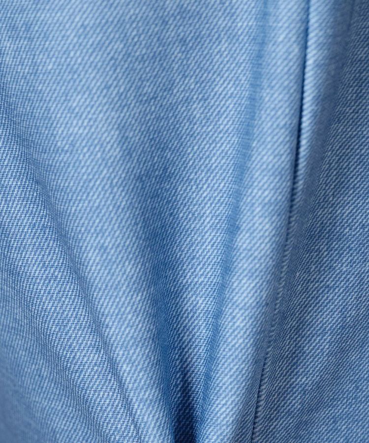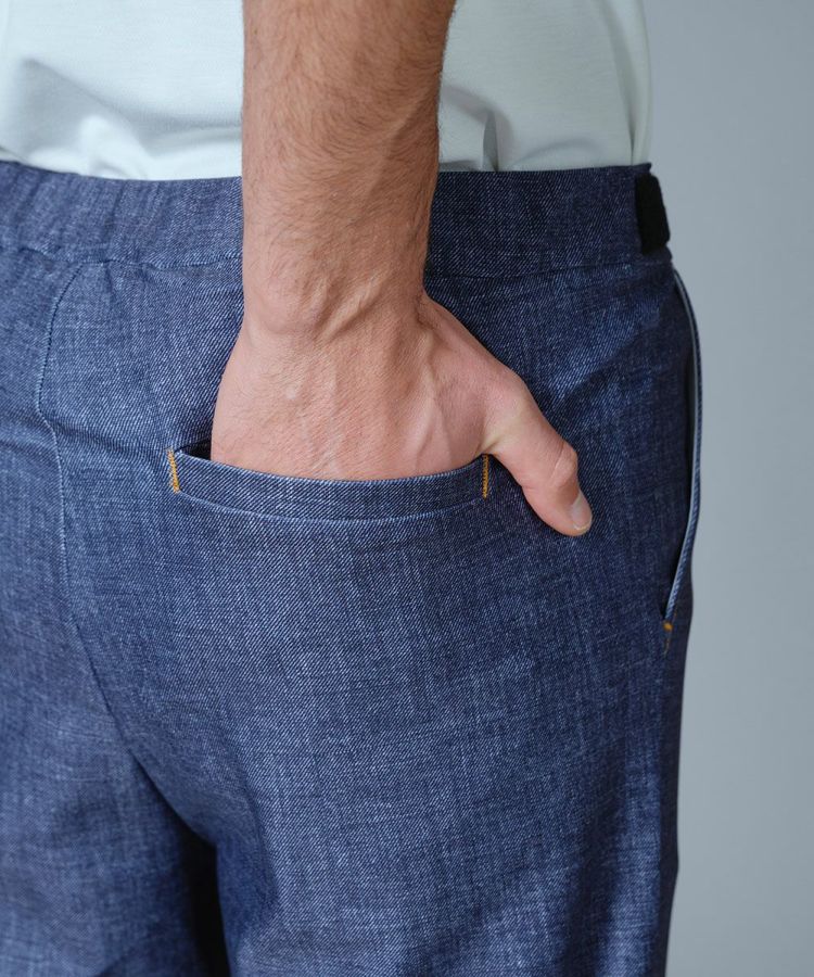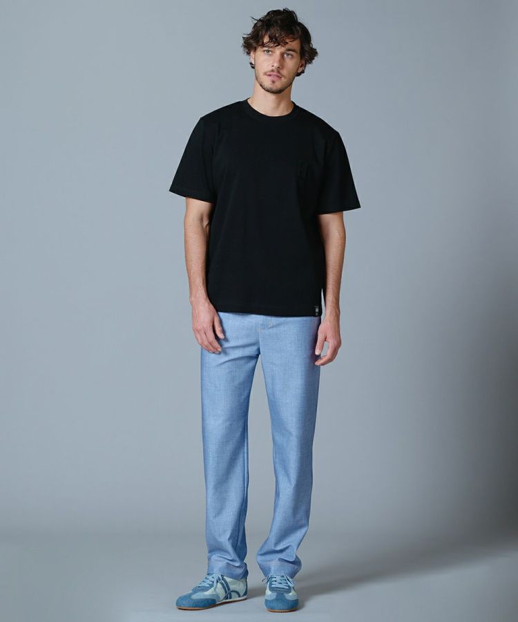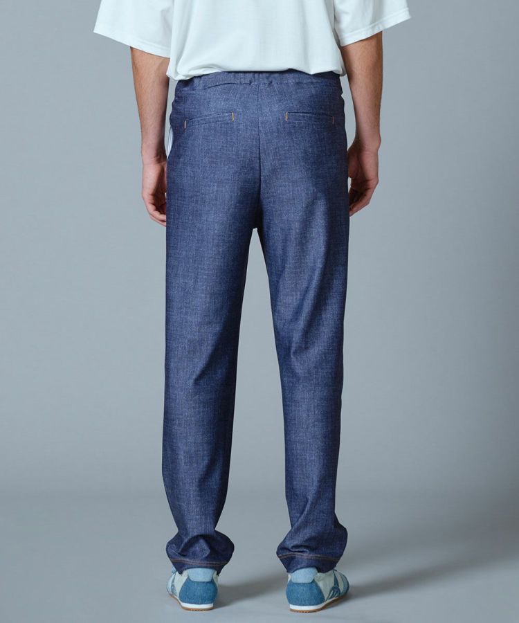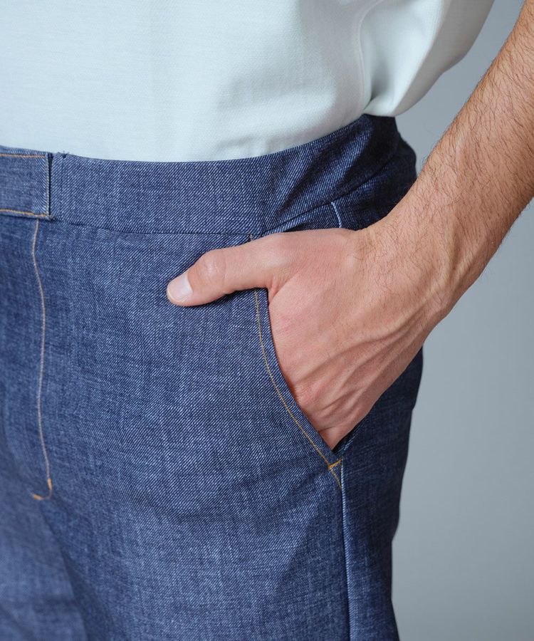 リアルなデニム柄を転写プリントしたデザイン性が高いパンツ。程よい伸縮性と柔らかさを兼ね備えたトリコット素材を採用し、機能面にも配慮しました。カラーは爽やかなサックスとシックなインディゴの2色で展開。同素材のTシャツ(型番:0708070253)と合わせれば、一味違うデニムセットアップコーデを楽しめます。